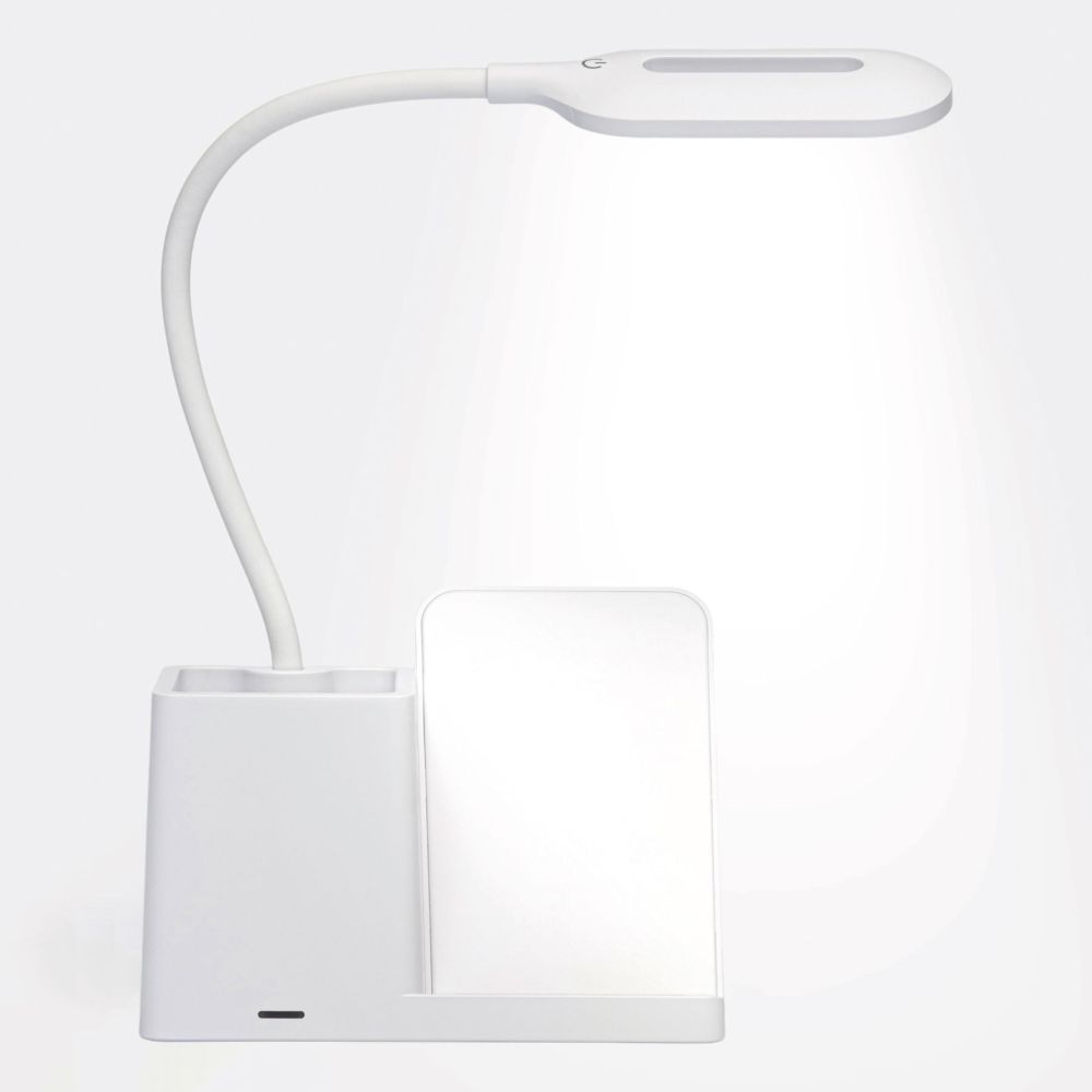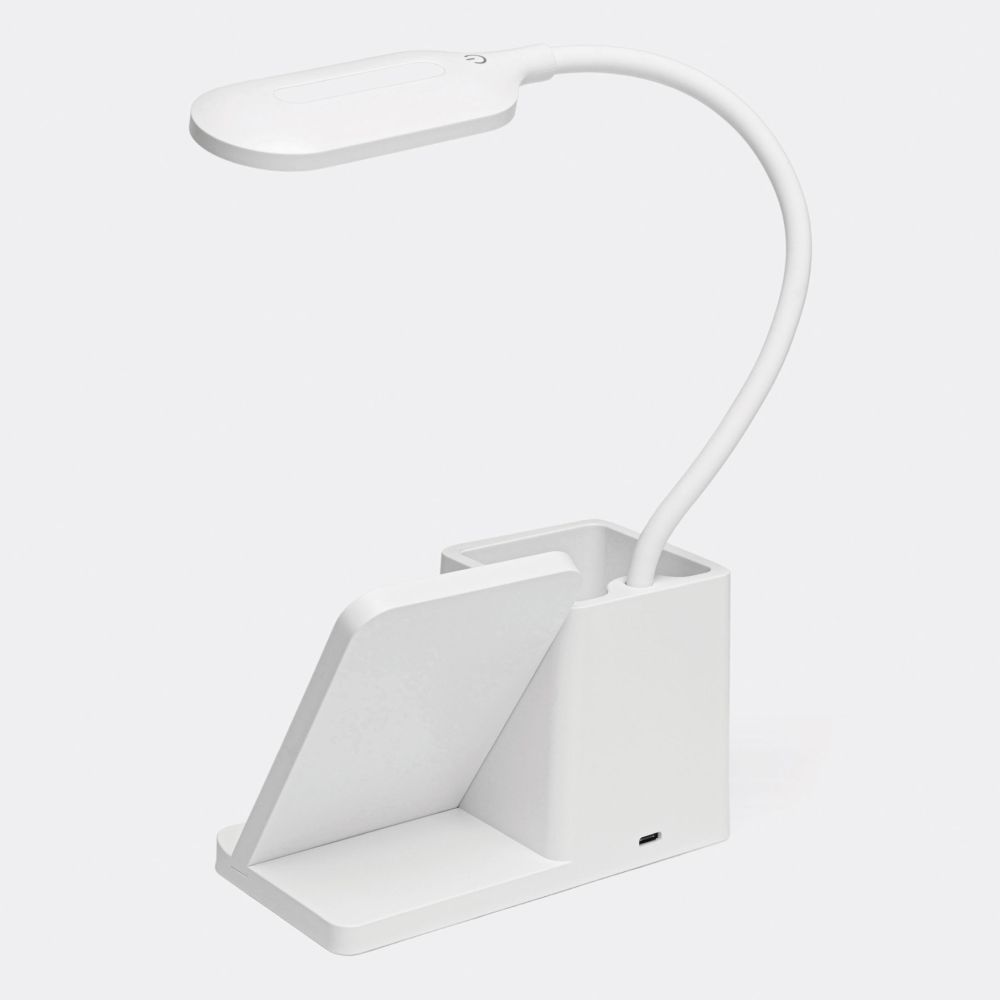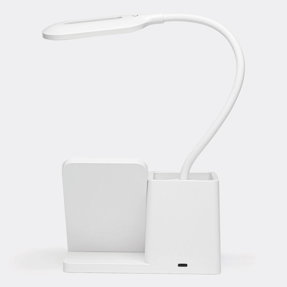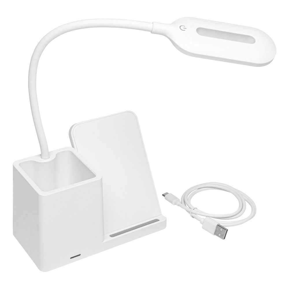 Desk lamp with charging station LIGHT & CHARGE: 360° flexible swivel lighting arm with 10 warm white and 10 cool white LEDs, touch sensitive on/off, pen holder and wireless charging station, wireless charging of the device by touching it to the contact surface (the device has to be equipped for inductive charging), USB cable with USB Type-C plug (length approx. 102 cm), operating indicator light, input power: 5V/9V, 2A, output power: max. 10 W, with temperature control and foreign object detection, 4 non-slip feet on the bottom