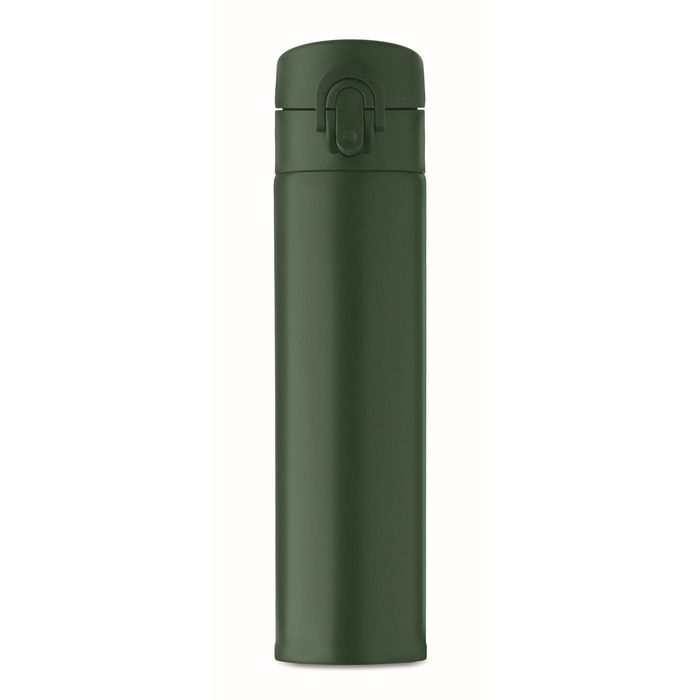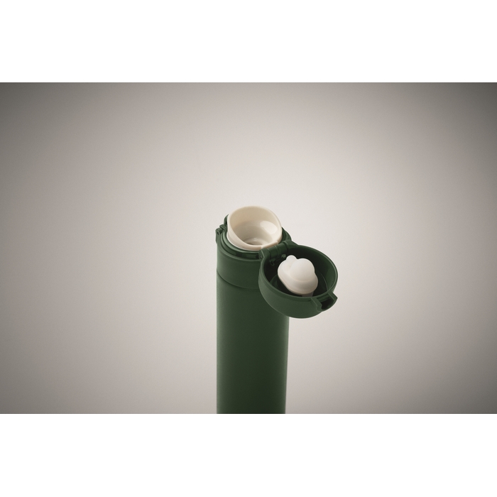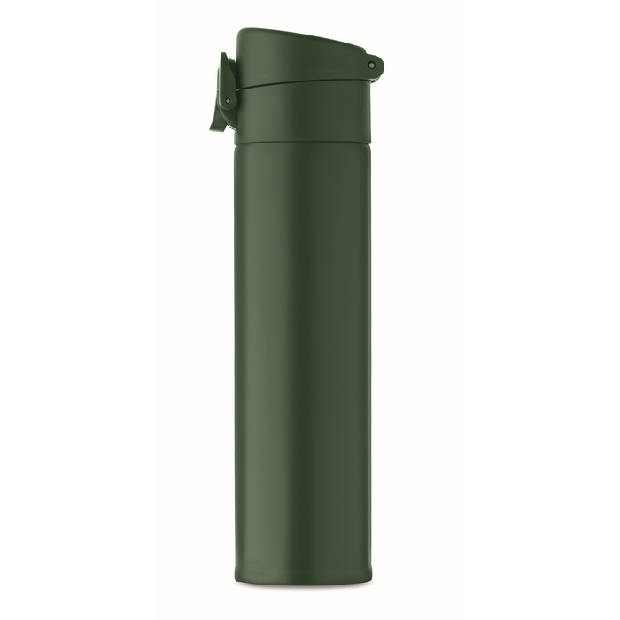 Double wall drinking bottle in recycled stainless steel (90% recycled stainless steel and 10% stainless steel) with security lock on the lid and press-to-open option. Leak free. Capacity: 300ml.Dimensions: O5,8 x 22,7cm