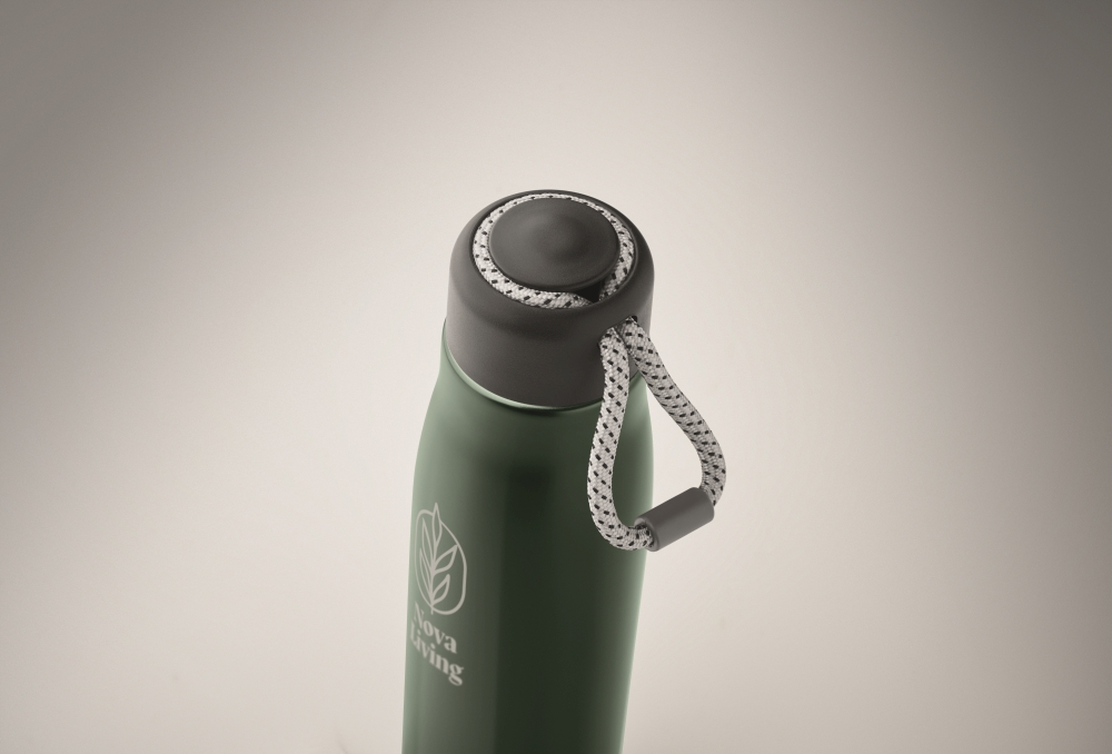 Double wall recycled stainless steel insulated vacuum bottle (90% recycled stainless steel and 10% stainless steel) with integrated cord grip on PP lid. Leak-free. Capacity: 500 ml. Dimensions: O 6,5 x 25 cm