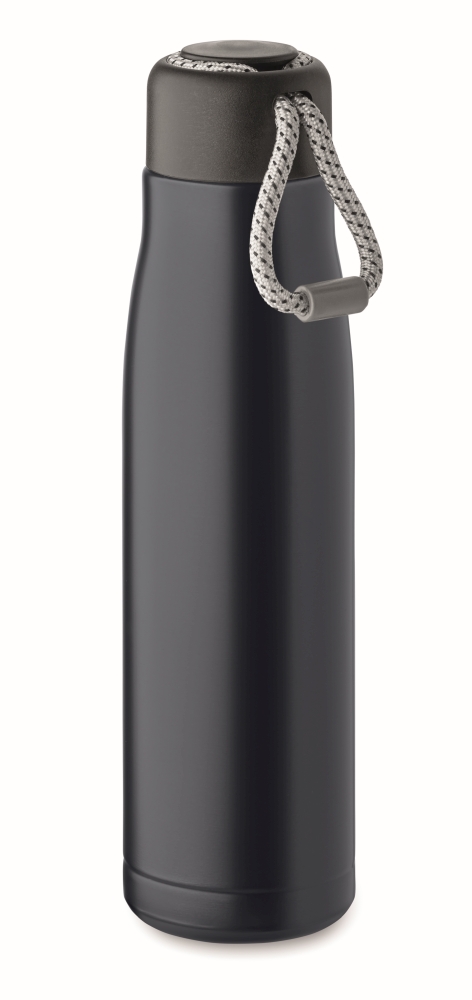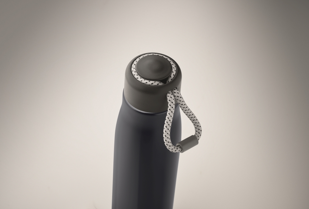 Double wall recycled stainless steel insulated vacuum bottle (90% recycled stainless steel and 10% stainless steel) with integrated cord grip on PP lid. Leak-free. Capacity: 500 ml. Dimensions: O 6,5 x 25 cm