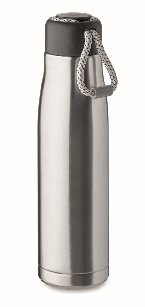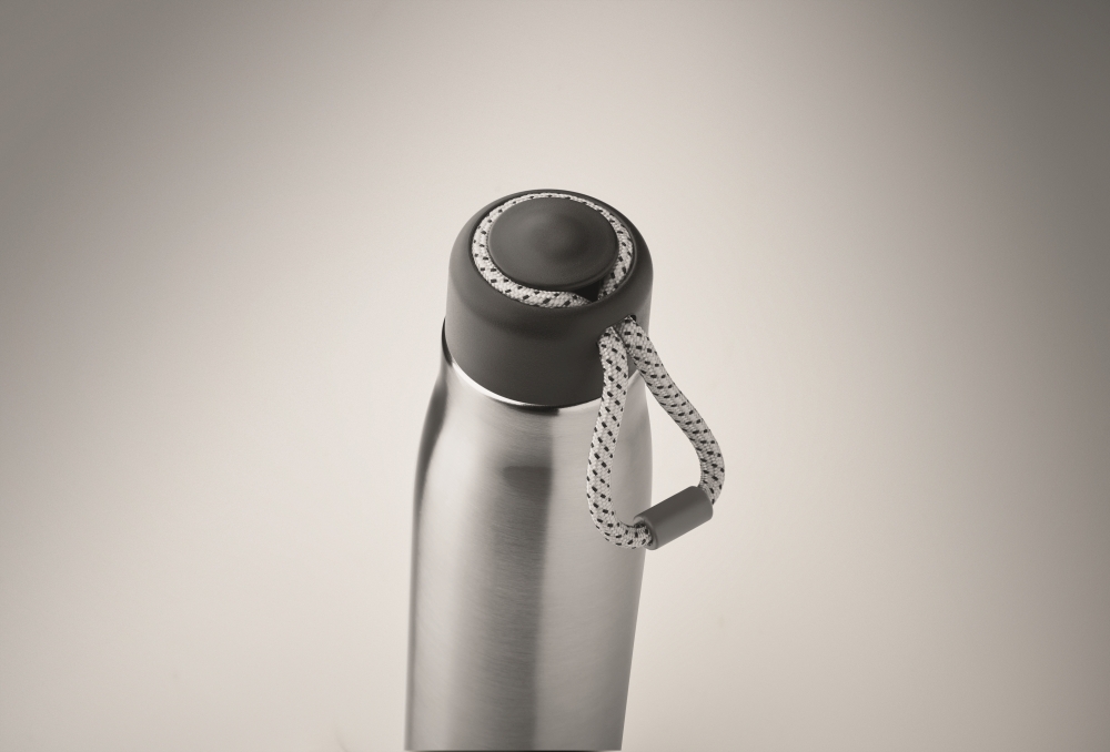 Double wall recycled stainless steel insulated vacuum bottle (90% recycled stainless steel and 10% stainless steel) with integrated cord grip on PP lid. Leak-free. Capacity: 500 ml. Dimensions: O 6,5 x 25 cm