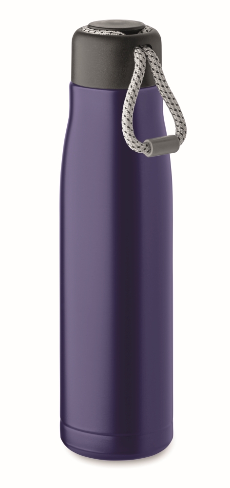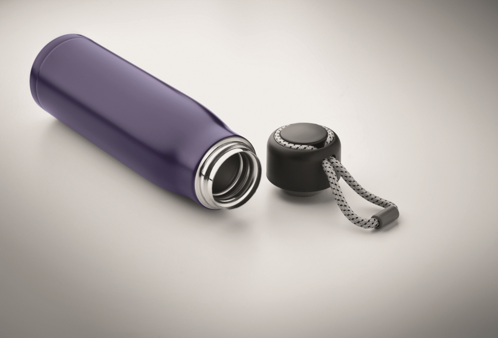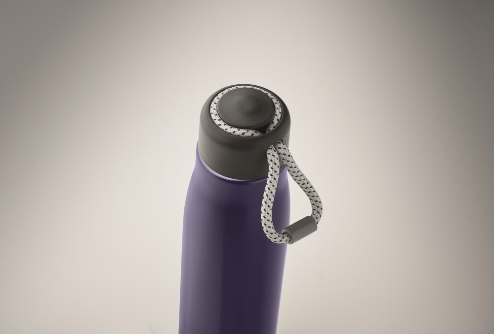 Double wall recycled stainless steel insulated vacuum bottle (90% recycled stainless steel and 10% stainless steel) with integrated cord grip on PP lid. Leak-free. Capacity: 500 ml. Dimensions: O 6,5 x 25 cm