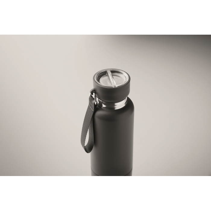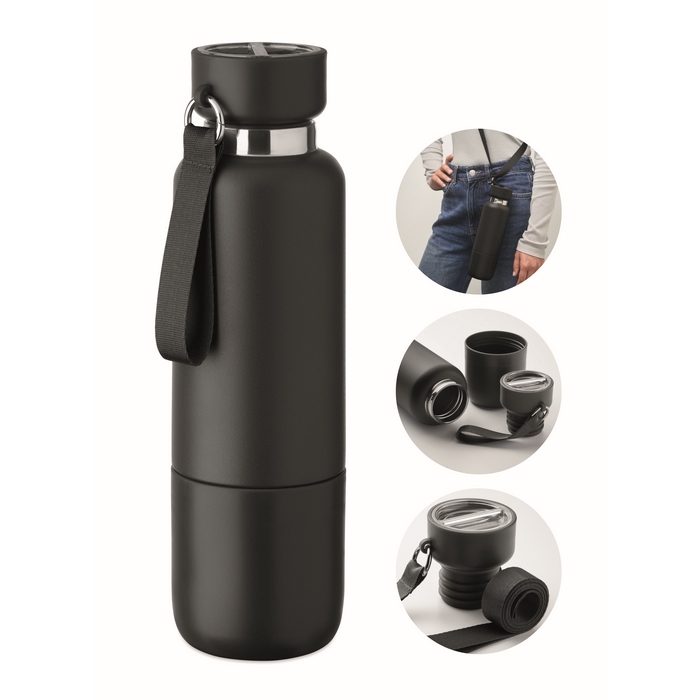 Double wall insulated bottle in 90% recycled stainless steel and 10% stainless steel, with integrated strap handle and additional long strap (70cm) in PP lid. Leak-free. Bottom cup included. Capacity: 500 ml.Dimensions: O7,5 x 25,8cm