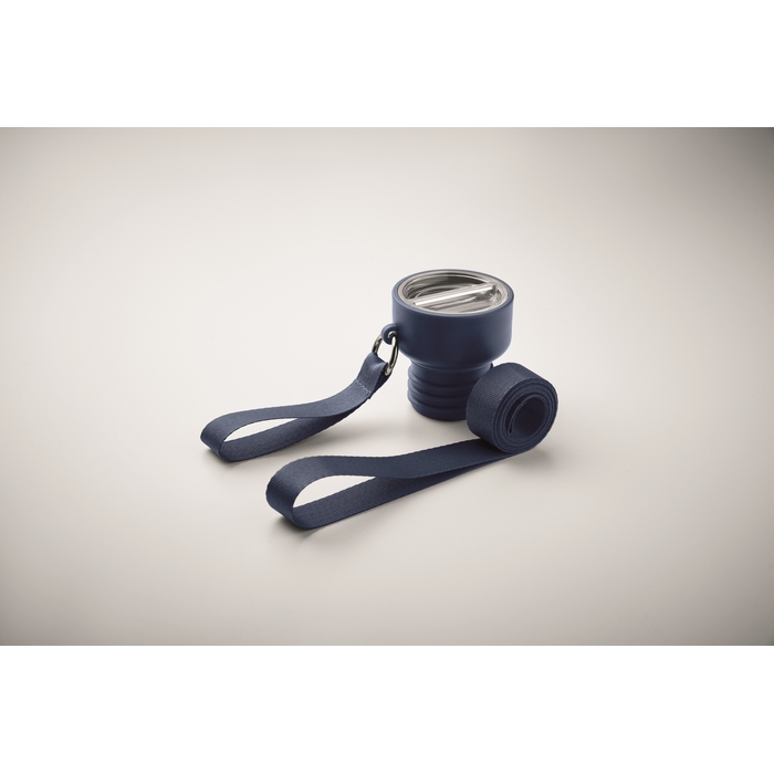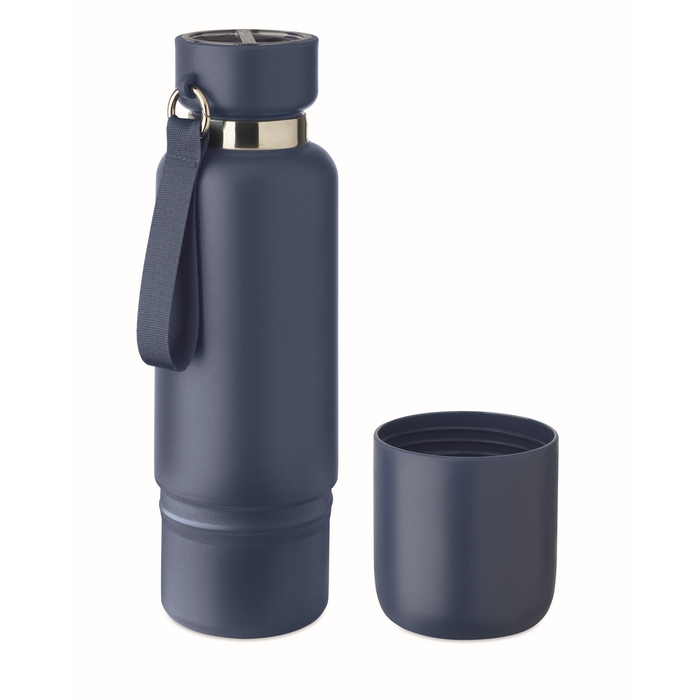 Double wall insulated bottle in 90% recycled stainless steel and 10% stainless steel, with integrated strap handle and additional long strap (70cm) in PP lid. Leak-free. Bottom cup included. Capacity: 500 ml.Dimensions: O7,5 x 25,8cm
