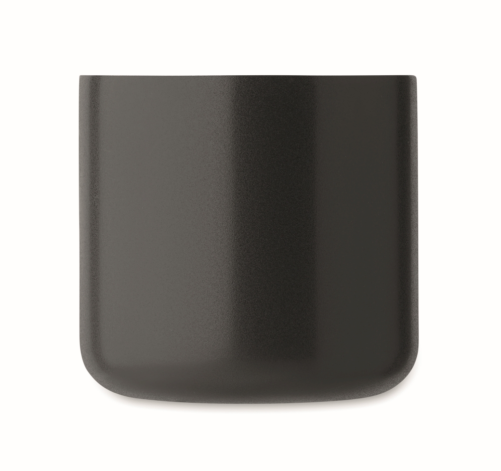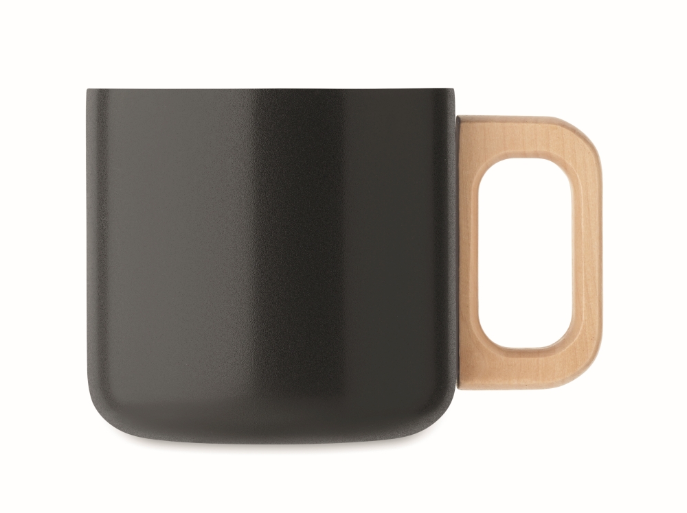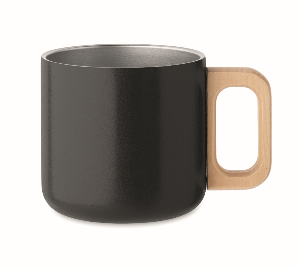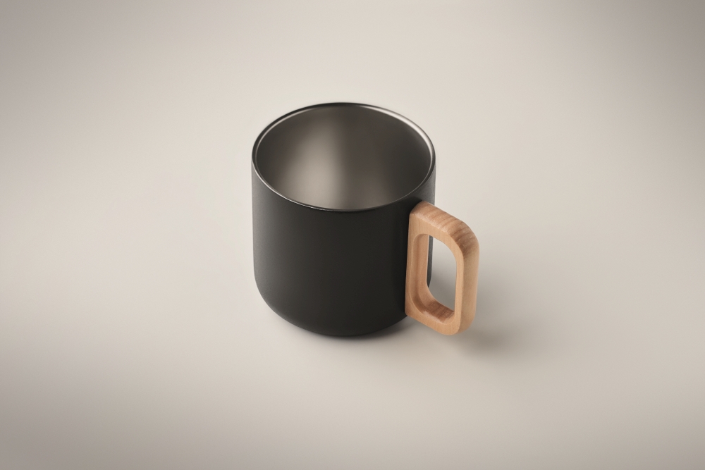 Double wall mug in recycled stainless steel (90% recycled stainless steel and 10% stainless steel) mug with wooden handle. Capacity: 350 ml. Dimensions: O 8,5 x 8 cm