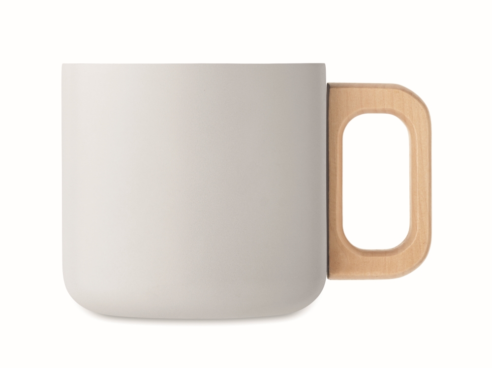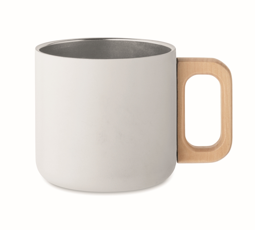 Double wall mug in recycled stainless steel (90% recycled stainless steel and 10% stainless steel) mug with wooden handle. Capacity: 350 ml. Dimensions: O 8,5 x 8 cm