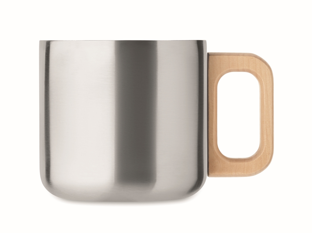 Double wall mug in recycled stainless steel (90% recycled stainless steel and 10% stainless steel) mug with wooden handle. Capacity: 350 ml. Dimensions: O 8,5 x 8 cm