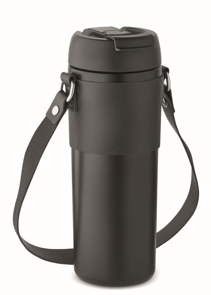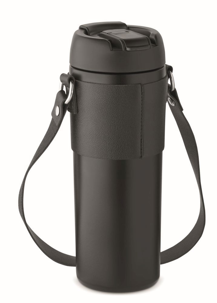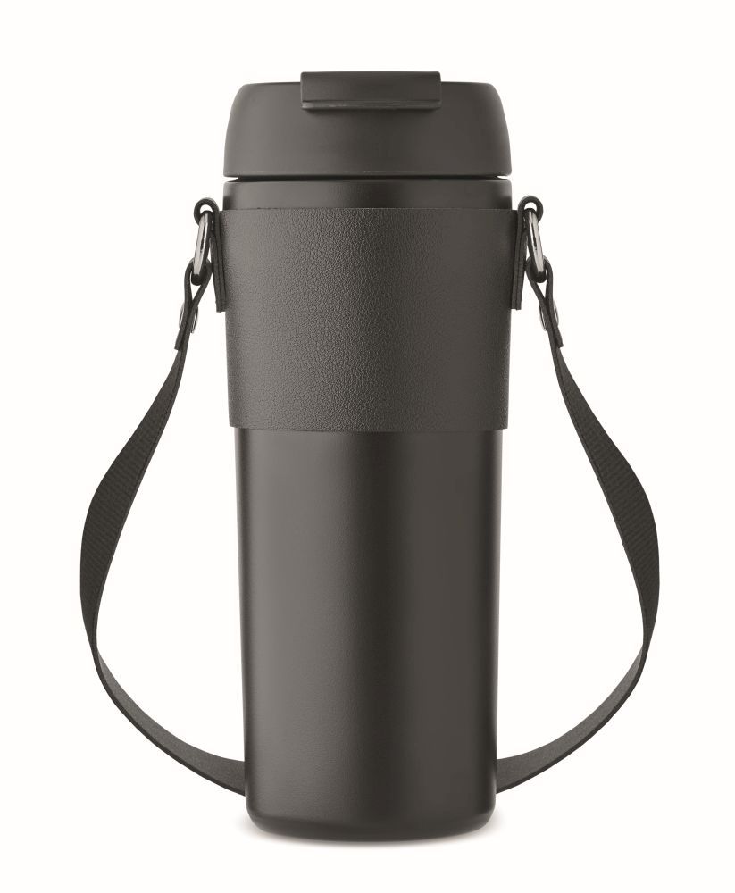 Double wall stainless steel powder coated tumbler with PP lid (2-in-1 straw lid) and with PU carry strap. Leak-free. Capacity: 700 ml.