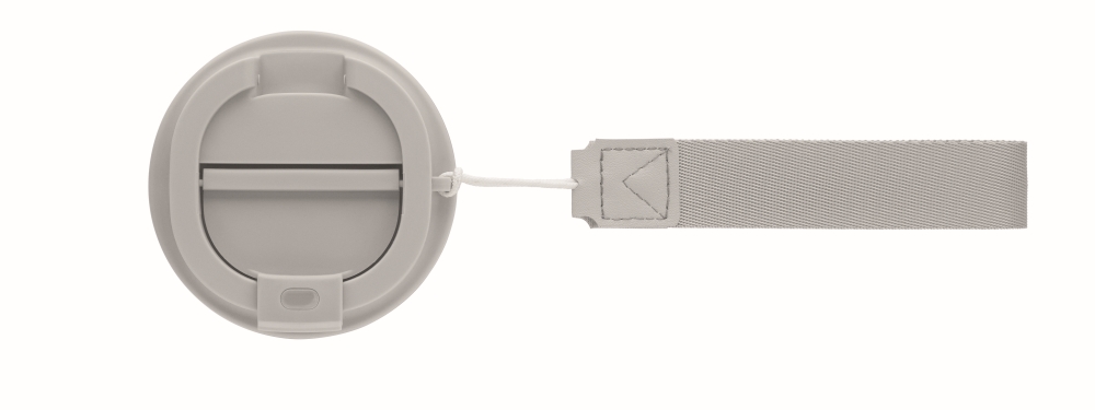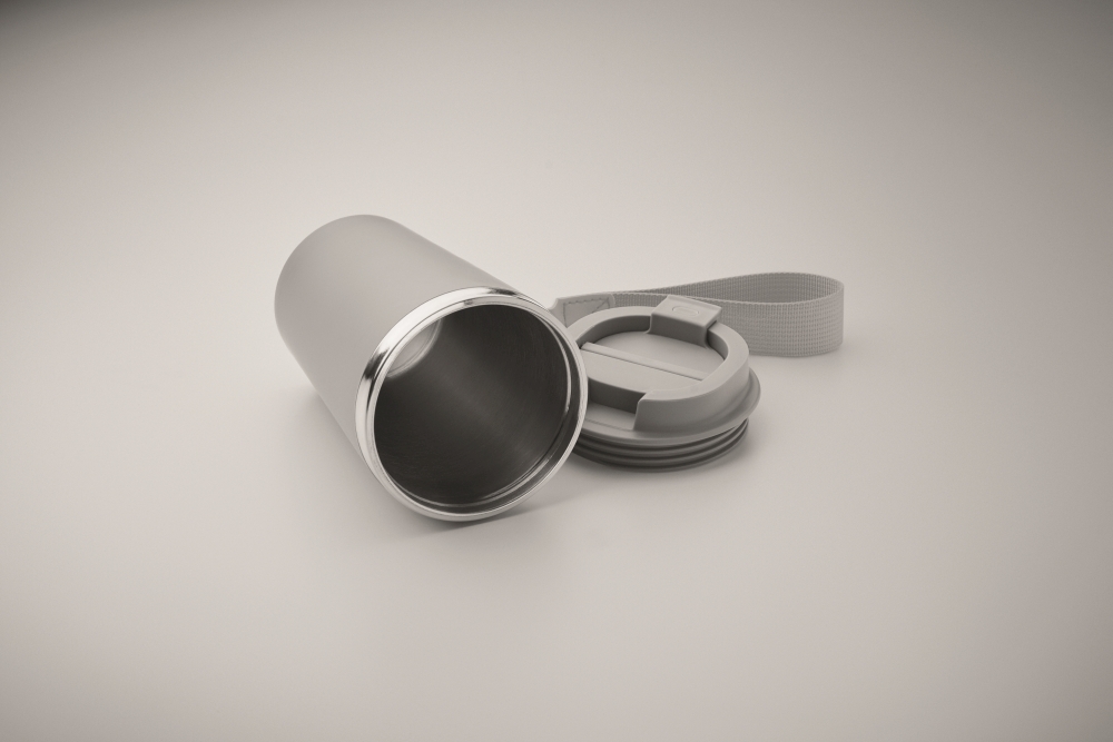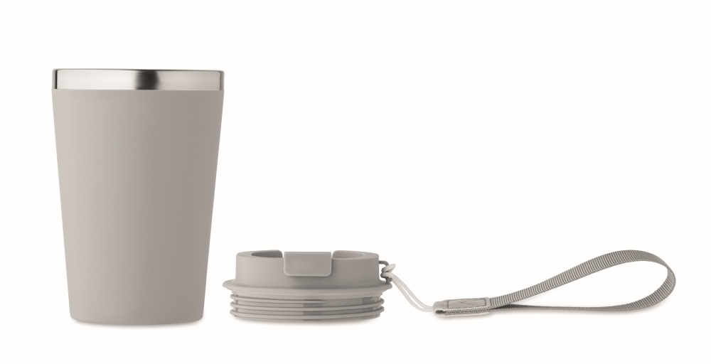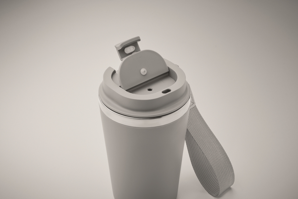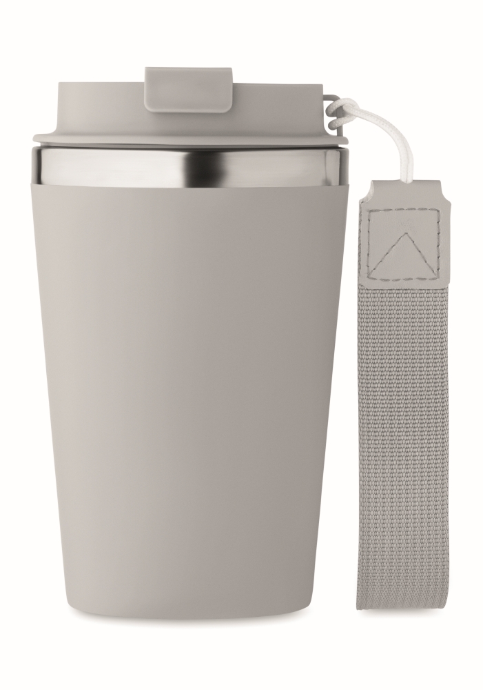 Double wall tumbler in recycled stainless steel (90% recycled stainless steel and 10% stainless steel) with recycled PP outside layer with RPET wrist strap. Leak-free. Capacity: 350 ml. Dimensions: O 8,5 x 14 cm