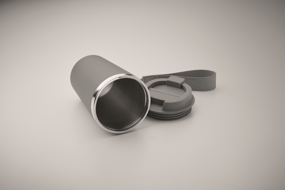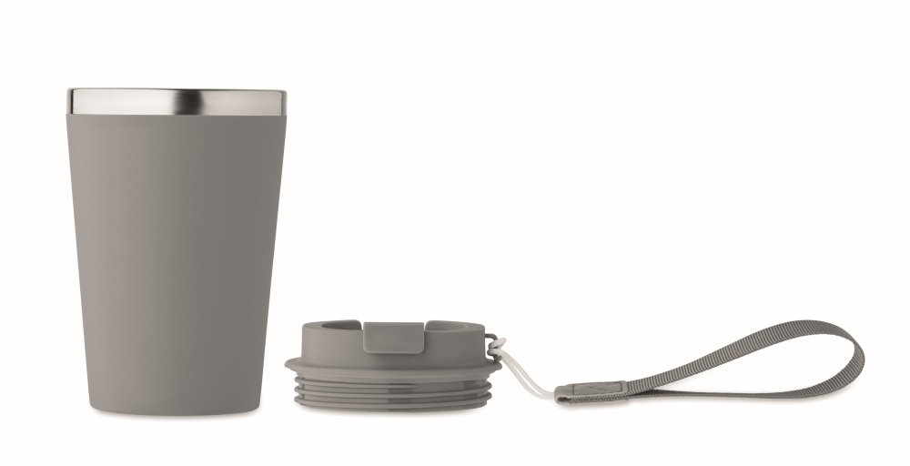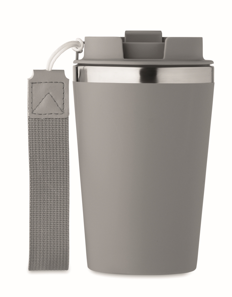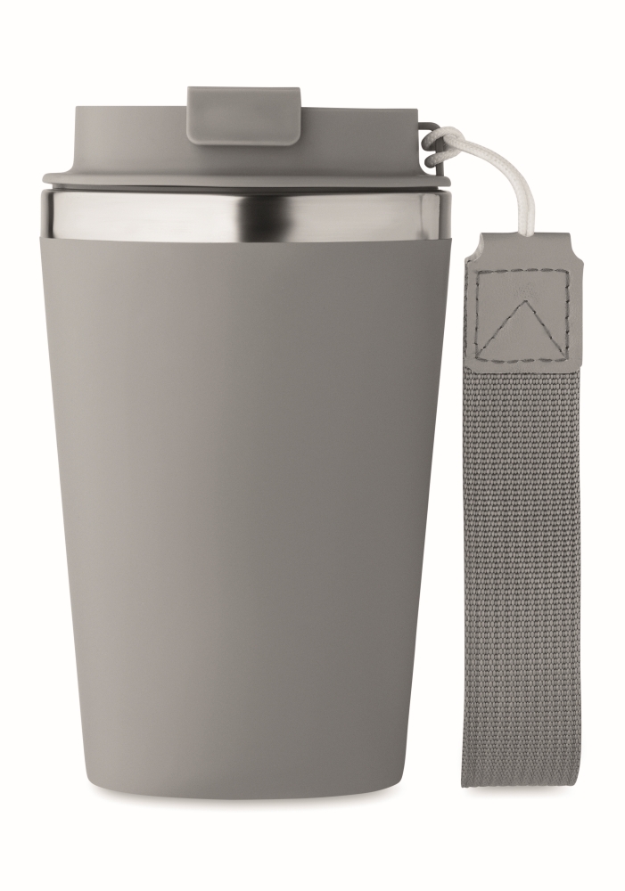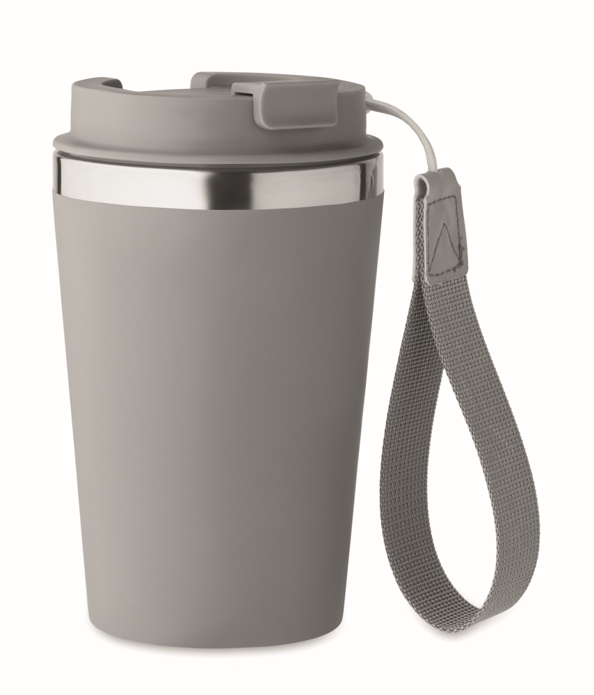 Double wall tumbler in recycled stainless steel (90% recycled stainless steel and 10% stainless steel) with recycled PP outside layer with RPET wrist strap. Leak-free. Capacity: 350 ml. Dimensions: O 8,5 x 14 cm
