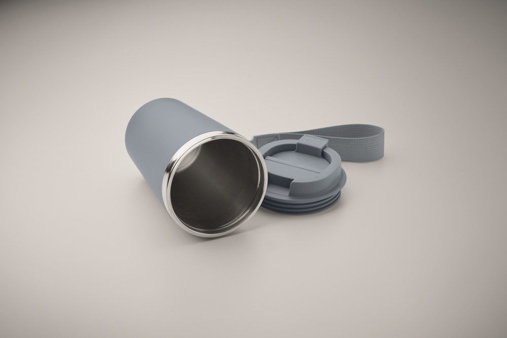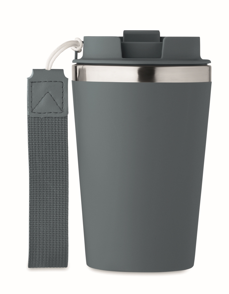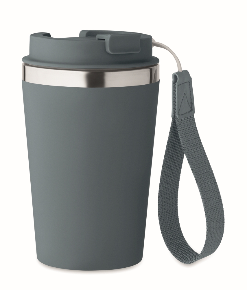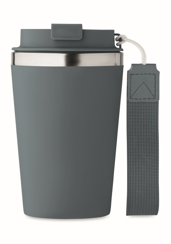 Double wall tumbler in recycled stainless steel (90% recycled stainless steel and 10% stainless steel) with recycled PP outside layer with RPET wrist strap. Leak-free. Capacity: 350 ml. Dimensions: O 8,5 x 14 cm