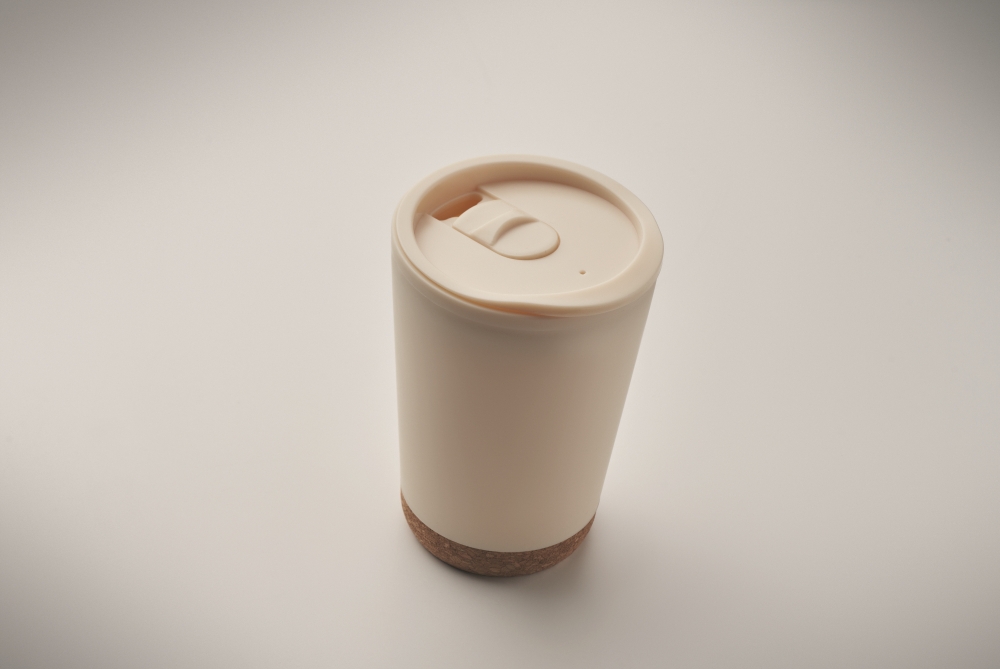 Double wall tumbler in PP with cork base and slide closing drinking mouthpiece lid in PS and ABS. Capacity: 300 ml. Dimensions: O 8 x 12 cm