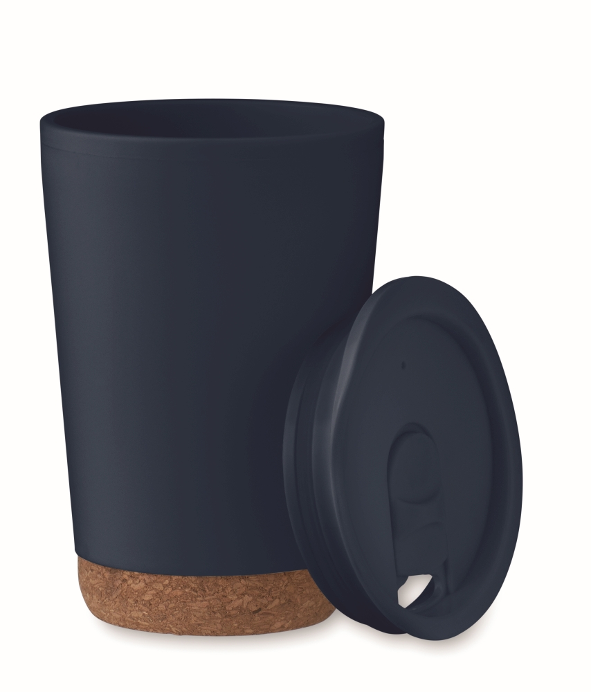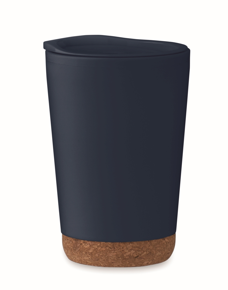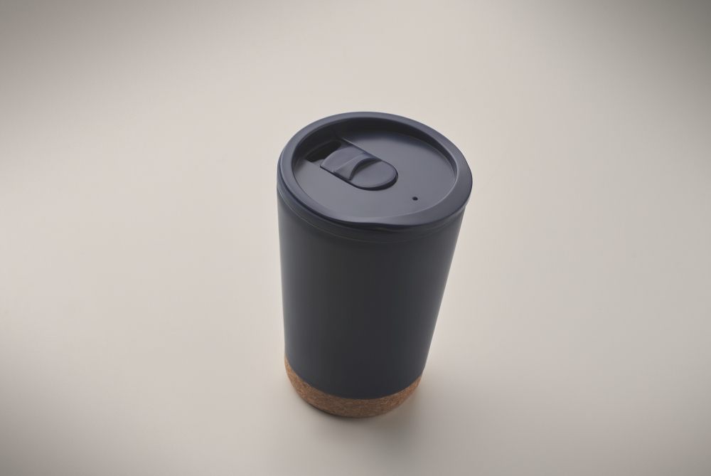 Double wall tumbler in PP with cork base and slide closing drinking mouthpiece lid in PS and ABS. Capacity: 300 ml. Dimensions: O 8 x 12 cm