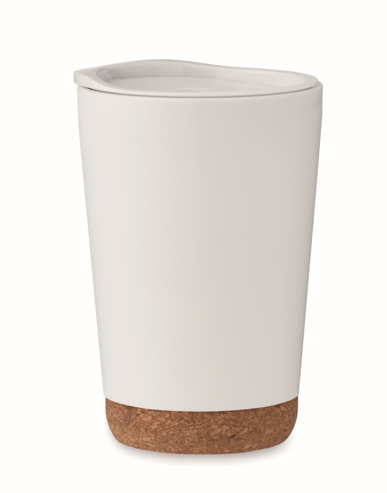 Double wall tumbler in PP with cork base and slide closing drinking mouthpiece lid in PS and ABS. Capacity: 300 ml. Dimensions: O 8 x 12 cm