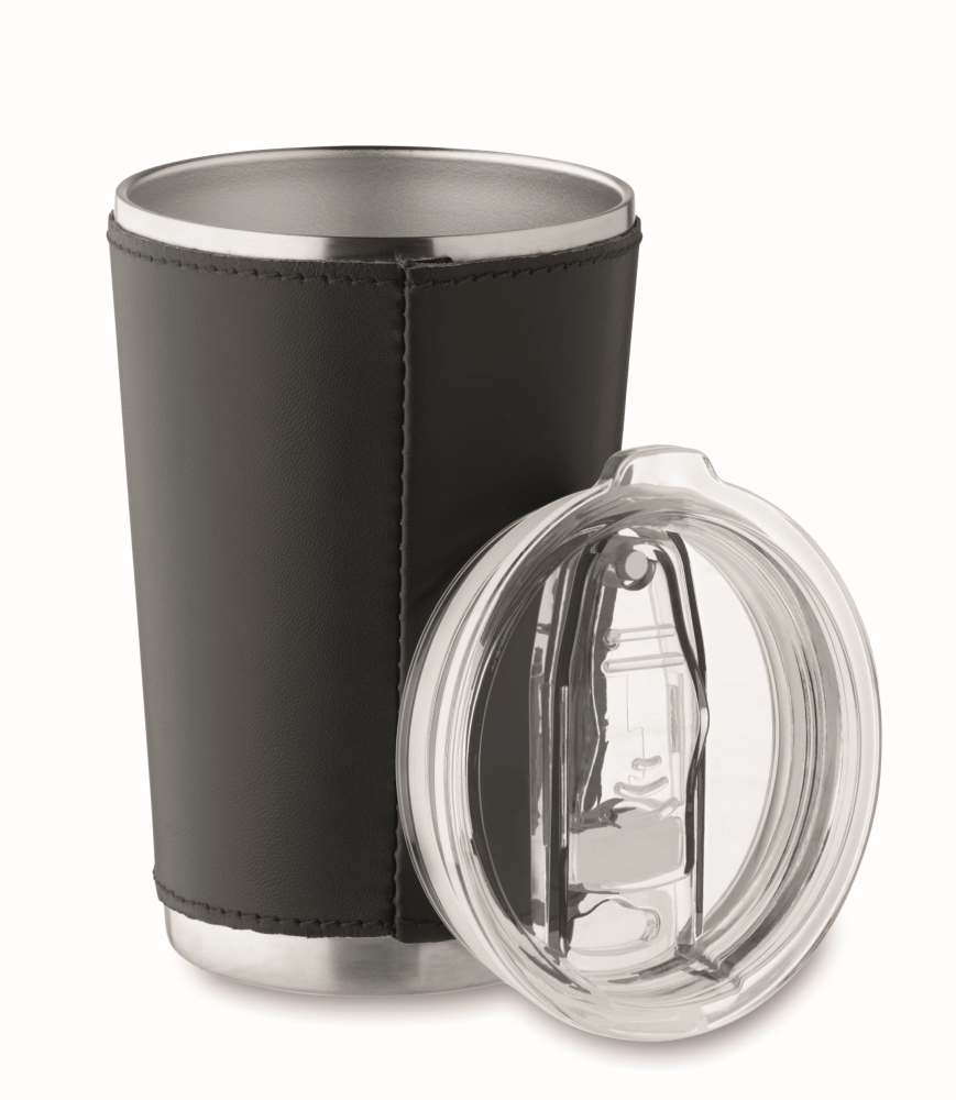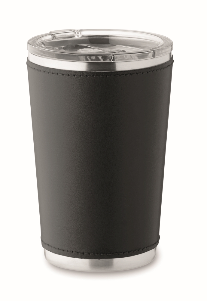 Double wall tumbler in recycled stainless steel (90% recycled stainless steel and 10% stainless steel) with removable PU leather sleeve. Lid with sliding sip hole. Leak-free. Capacity: 350 ml. Dimensions: O 8,5 x 12,5 cm