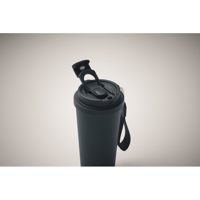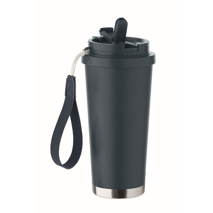Double wall 90% recycled stainless steel (90% recycled stainless and 10% stainless steel) tumbler with PP lid (2-in-1 drinking sip and straw lid) and with RPET carry strap. Leak-free. Capacity: 500 ml.Dimensions: O9 x 19cm