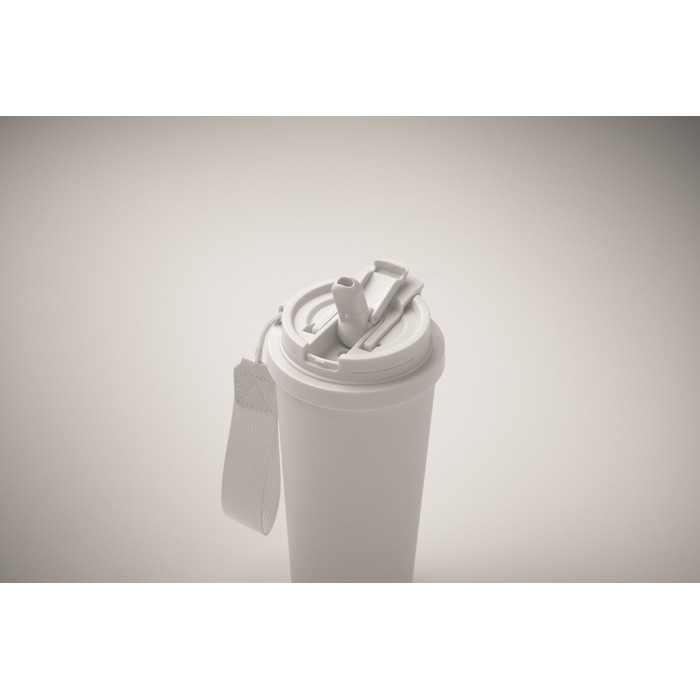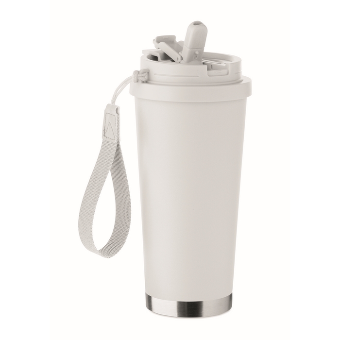 Double wall 90% recycled stainless steel (90% recycled stainless and 10% stainless steel) tumbler with PP lid (2-in-1 drinking sip and straw lid) and with RPET carry strap. Leak-free. Capacity: 500 ml.Dimensions: O9 x 19cm