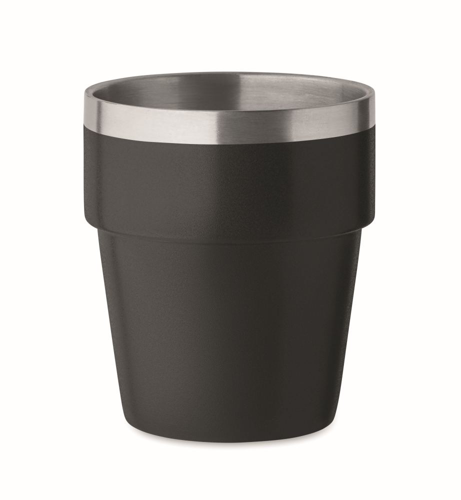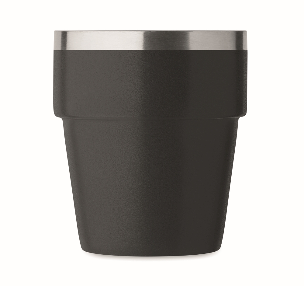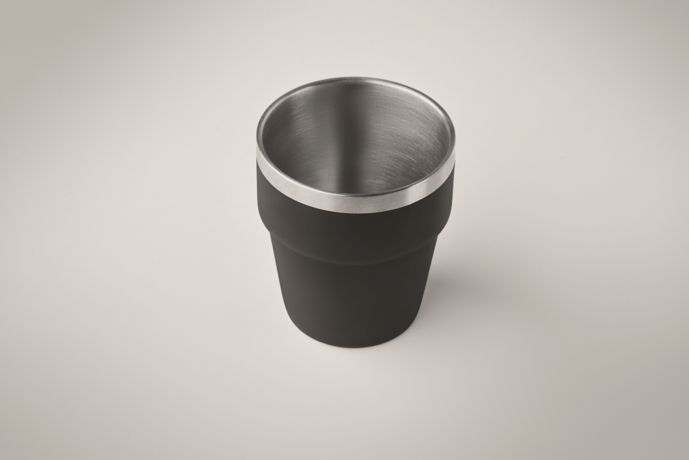 Double wall tumbler in recycled stainless (90% recycled stainless steel and 10% stainless steel) Stackable. Capacity: 250 ml. Dimensions: O 8 x 9 cm