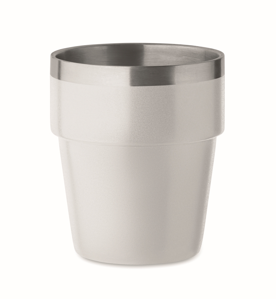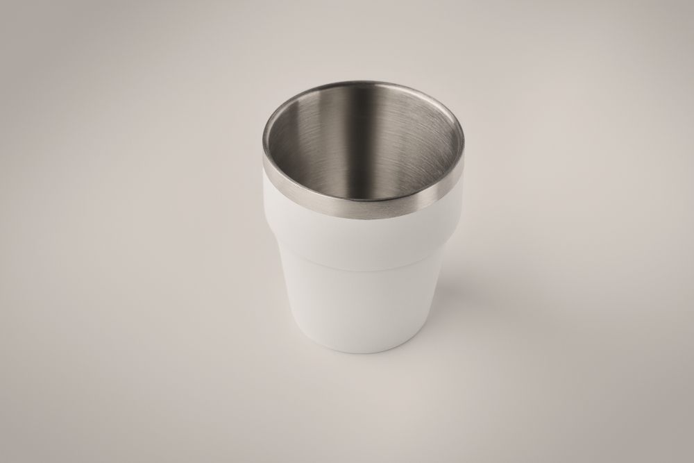 Double wall tumbler in recycled stainless (90% recycled stainless steel and 10% stainless steel) Stackable. Capacity: 250 ml. Dimensions: O 8 x 9 cm