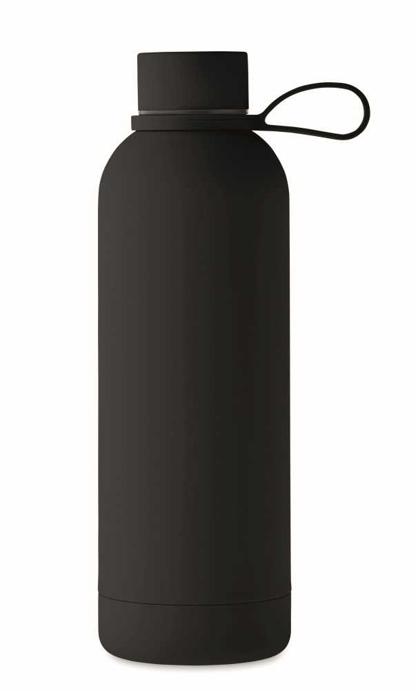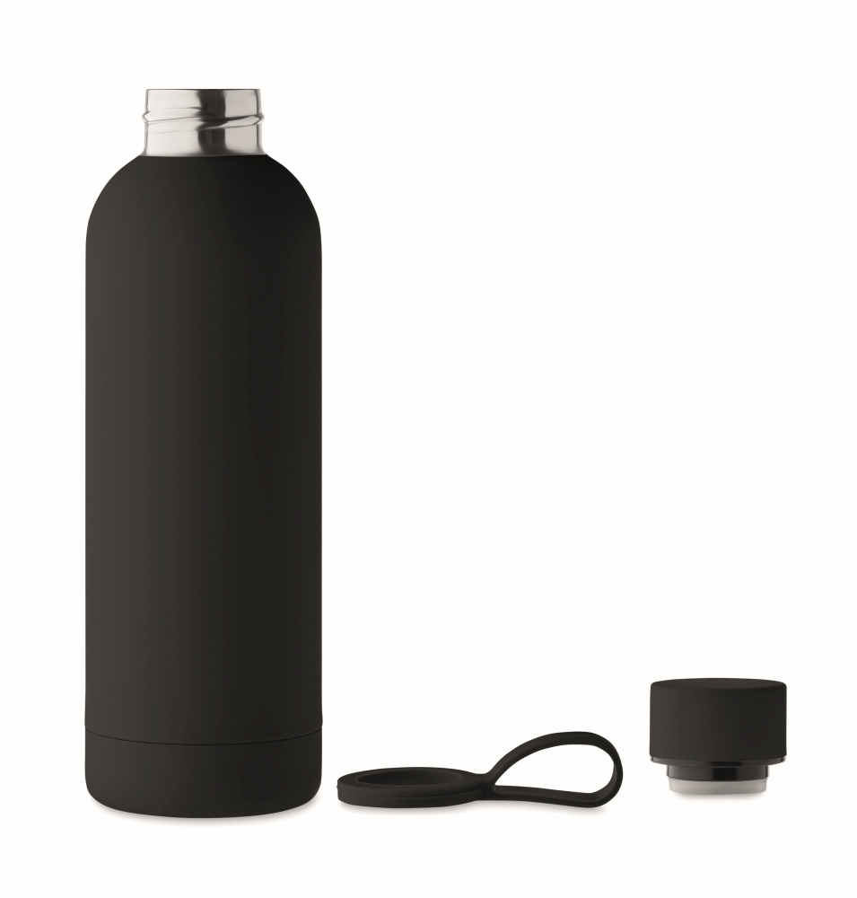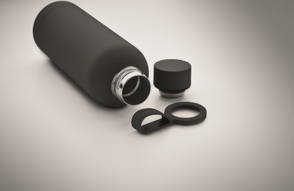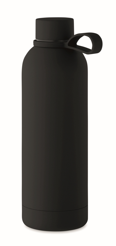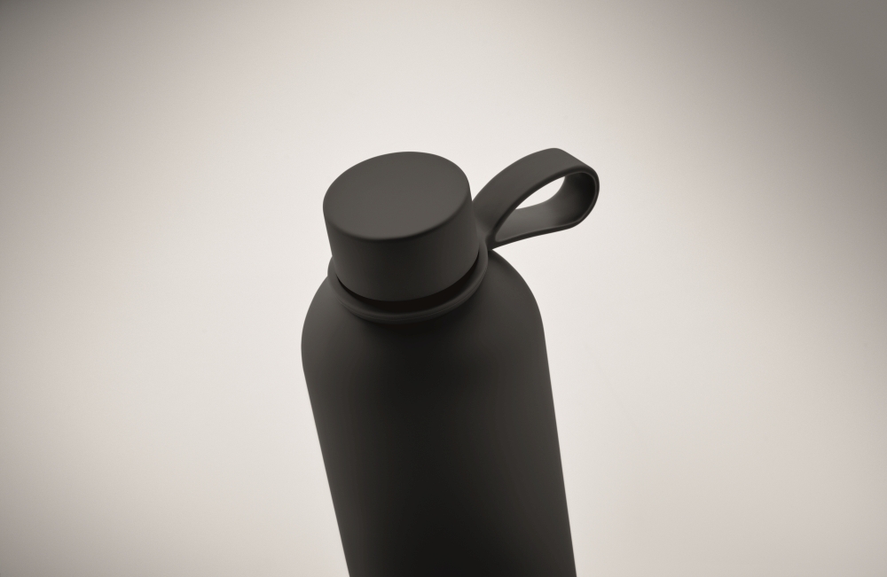 Double wall vacuum insulating bottle in recycled stainless steel (90% recycled stainless steel and 10% stainless steel) with rubber finish and silicone handle. Capacity: 500 ml. Dimensions: O 7 x 22,5 cm