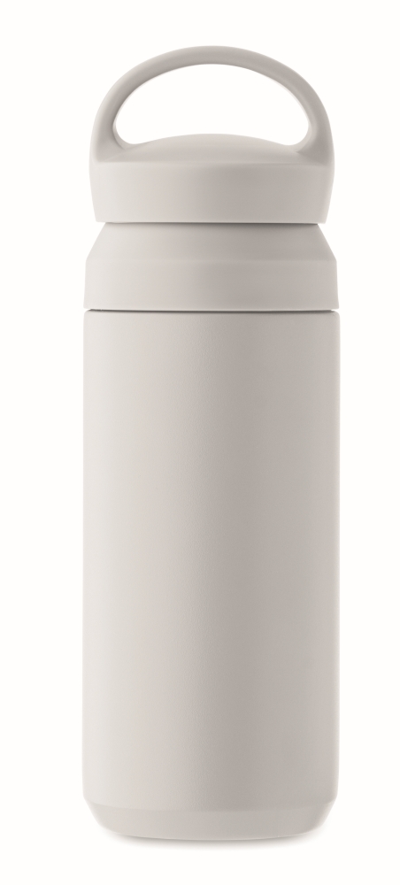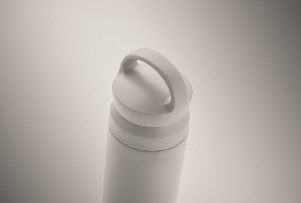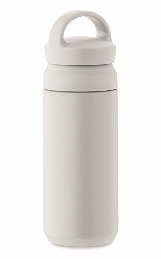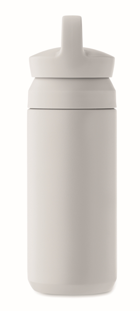 Double wall vacuum insulating bottle in recycled stainless steel (90% recycled stainless steel and 10% stainless steel) with recycled PP double lid opening for easy cleaning. Leak-free. Capacity: 320 ml. Dimensions: O 6,5 x 20 cm