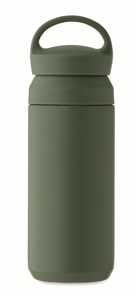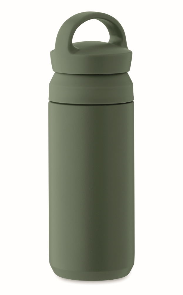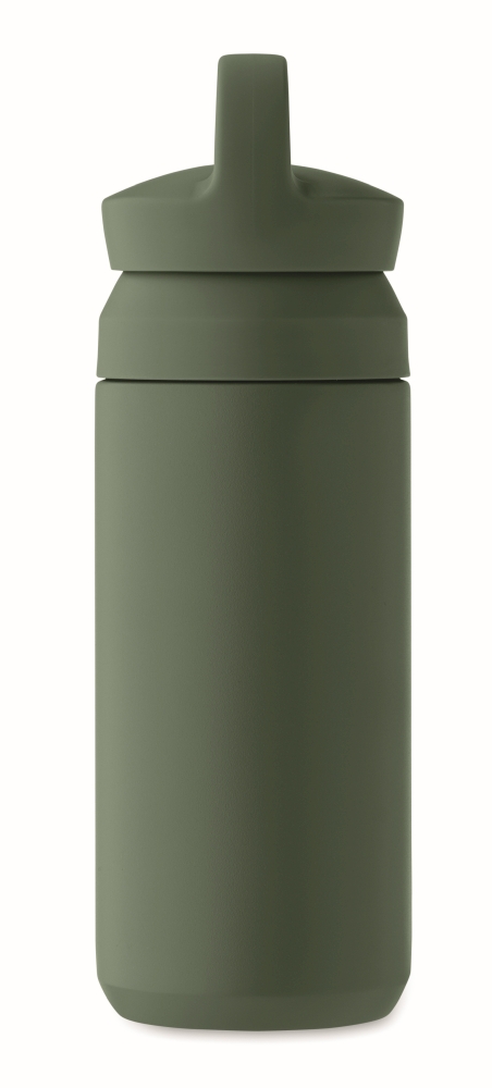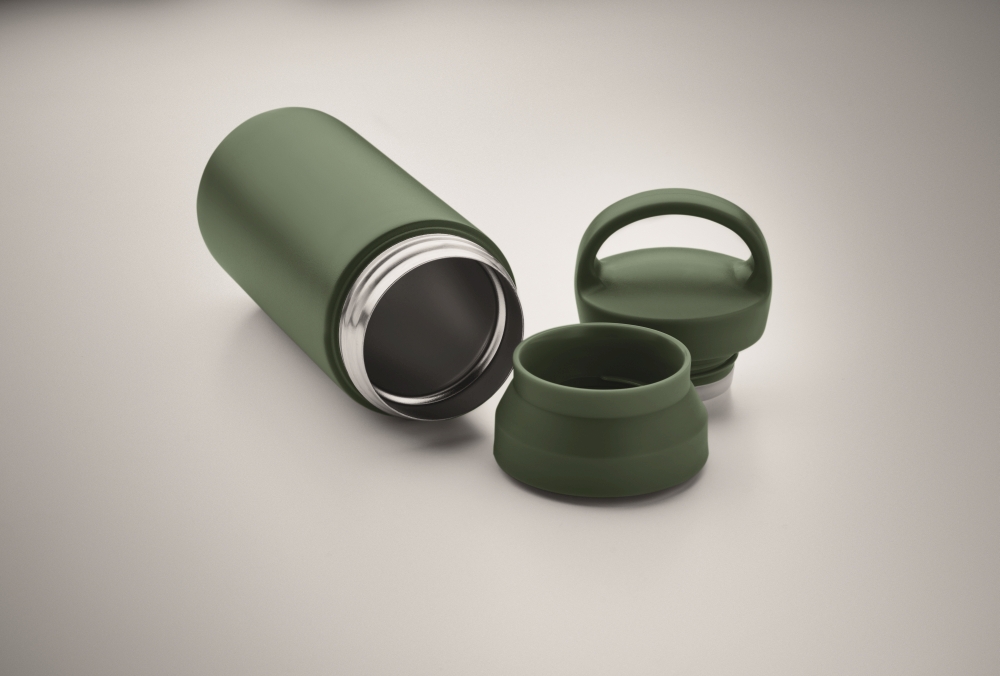 Double wall vacuum insulating bottle in recycled stainless steel (90% recycled stainless steel and 10% stainless steel) with recycled PP double lid opening for easy cleaning. Leak-free. Capacity: 320 ml. Dimensions: O 6,5 x 20 cm