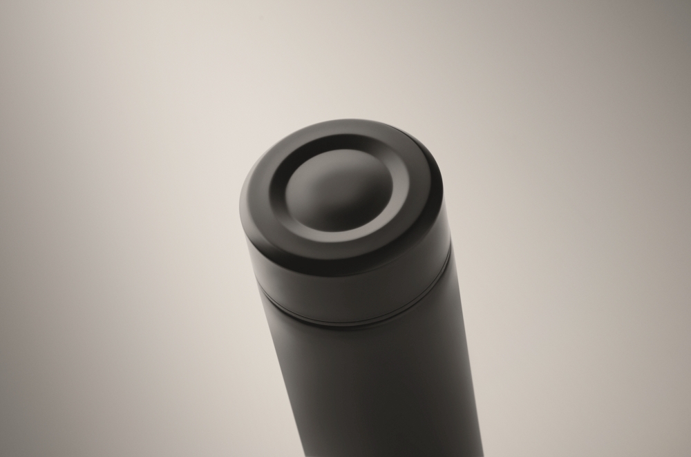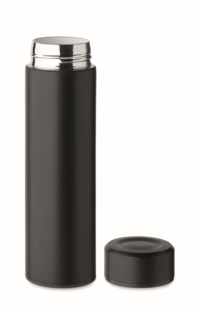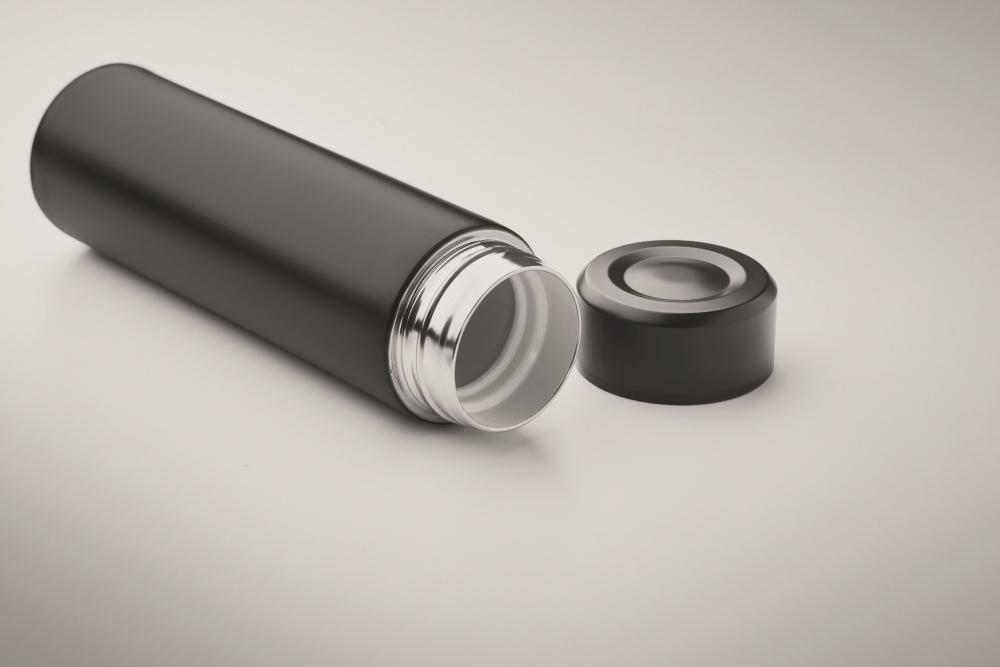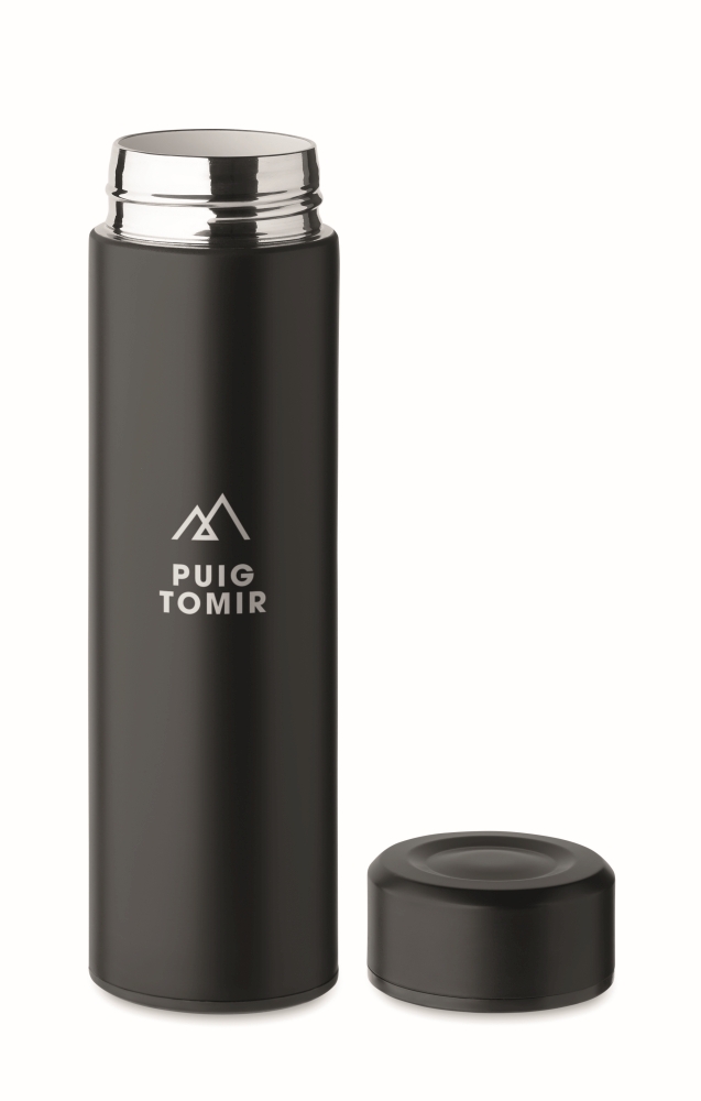 Double wall vacuum insulating bottle in recycled stainless steel (90% recycled stainless steel and 10% stainless steel) with ceramic inner lining. Leak-free. Capacity: 420 ml. Dimensions: O 6 x 22 cm