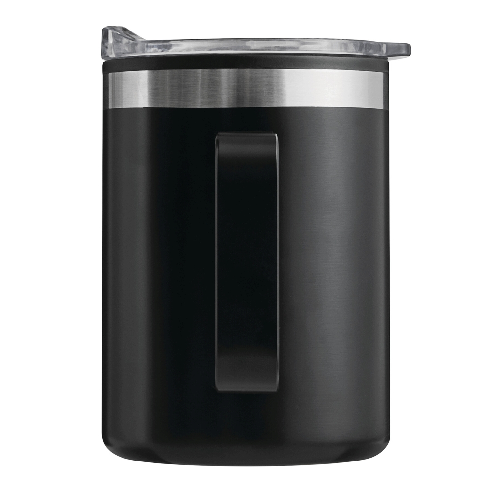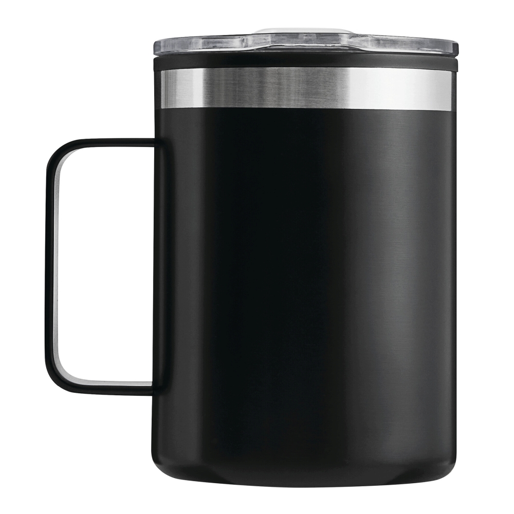 Double-walled travel mug: outside made of stainless steel and inside made of plastic, lid with silicone seal and integrated drinking opening, capacity approx. 400 ml, keeps warm for approx. 2 hours and cold for up to 4 hours, in box. Dimensions: O8,8 x 12,5 cm