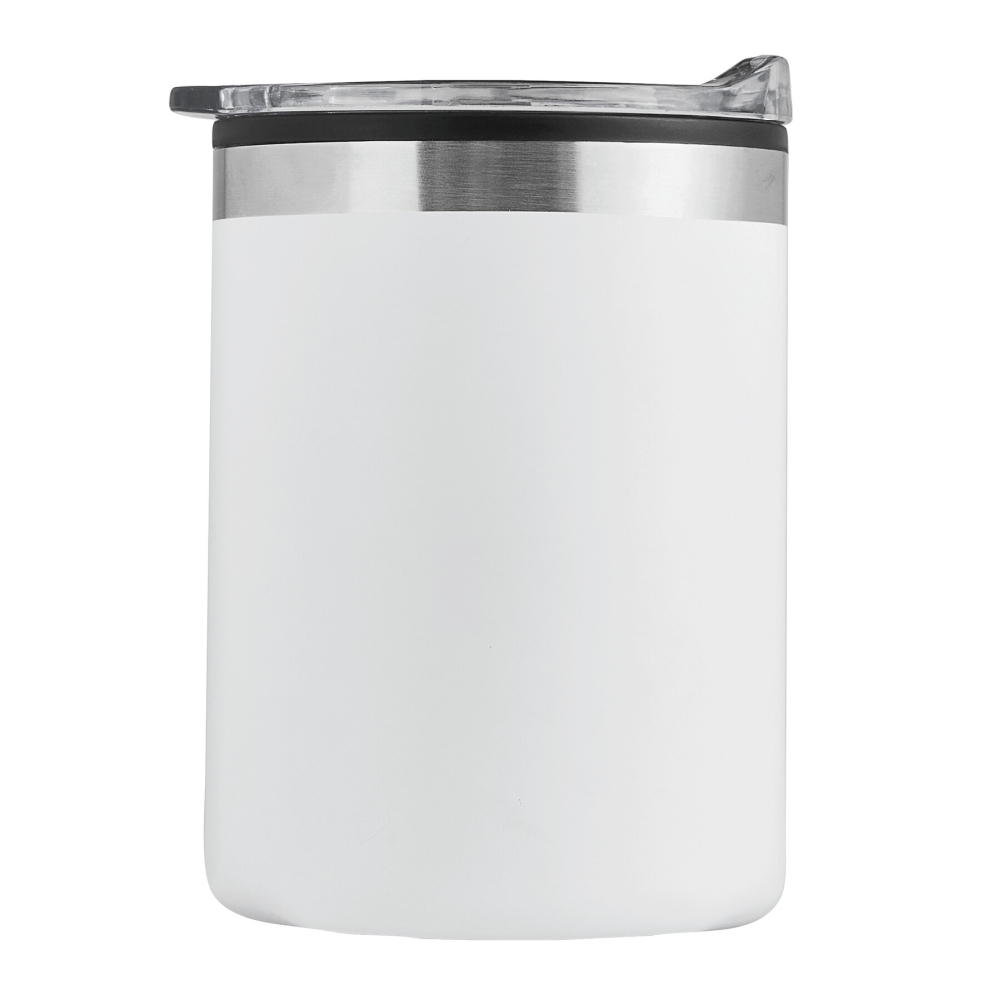 Double-walled travel mug: outside made of stainless steel and inside made of plastic, lid with silicone seal and integrated drinking opening, capacity approx. 400 ml, keeps warm for approx. 2 hours and cold for up to 4 hours, in box. Dimensions: O8,8 x 12,5 cm