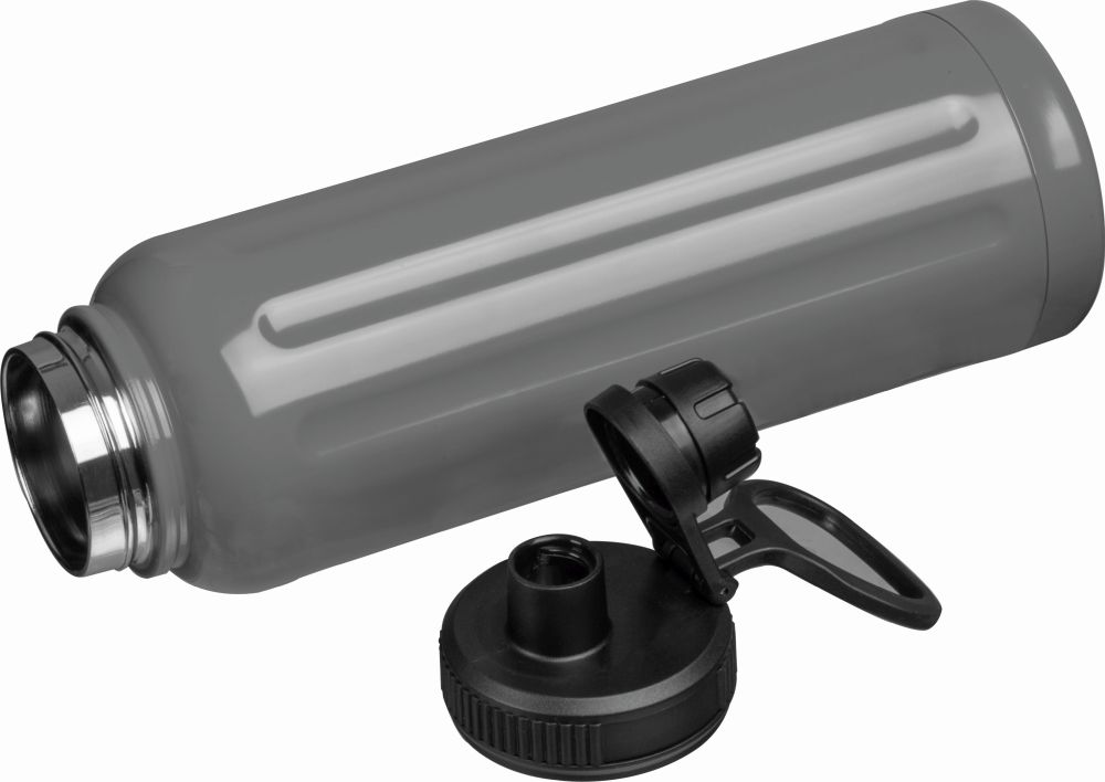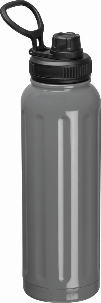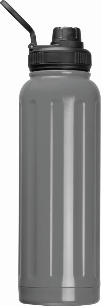 Large metal drinking bottle with 1200ml capacity and vacuum insulation. Equipped with a screw cap and additional quick-release fastener, as well as a loop. We will engrave your logo on the bottle.