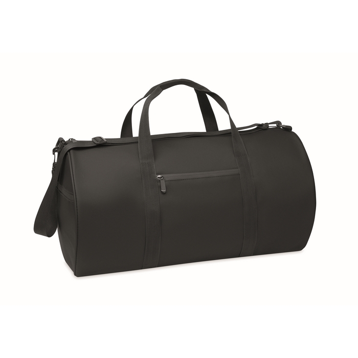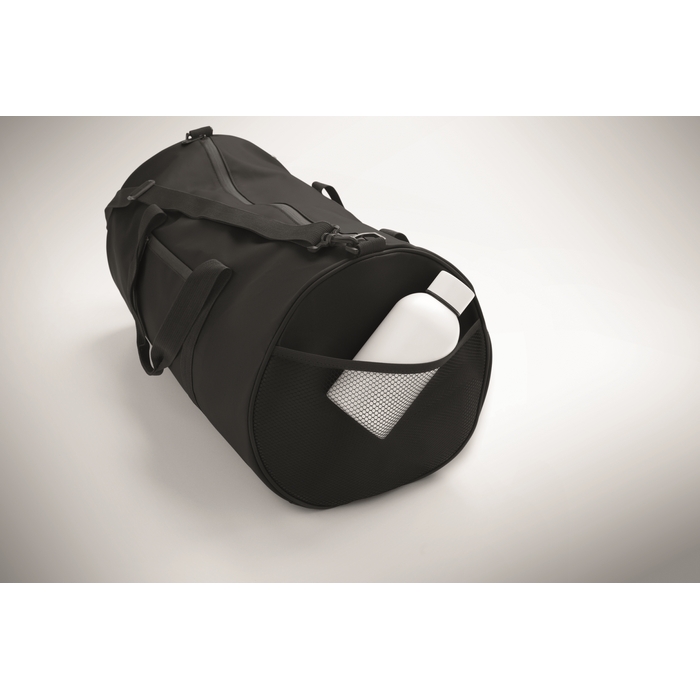 Duffle bag in 600D RPET polyester with PU coating. Front zippered pocket. Inside 210D RPET polyester lining. 1 side zippered compartment / 1 side mesh compartment. Zippered pocket inside.Dimensions: 51 x 28cm