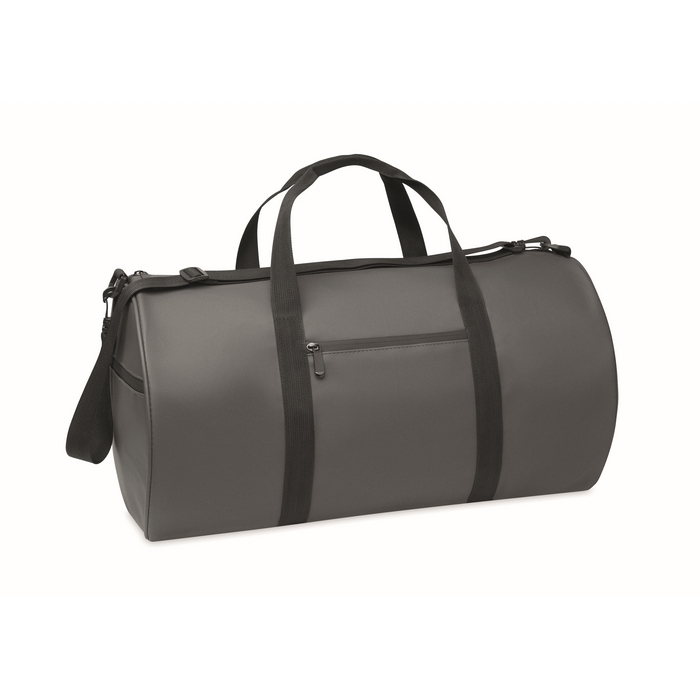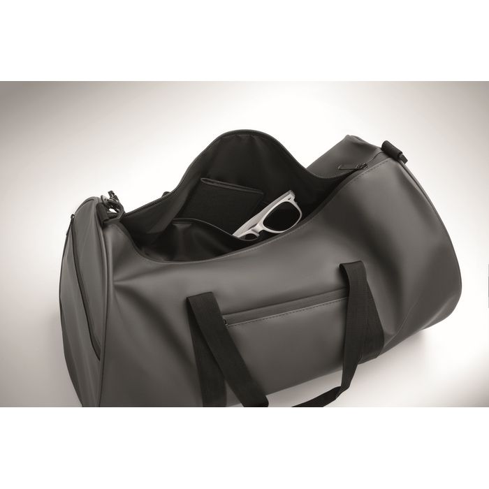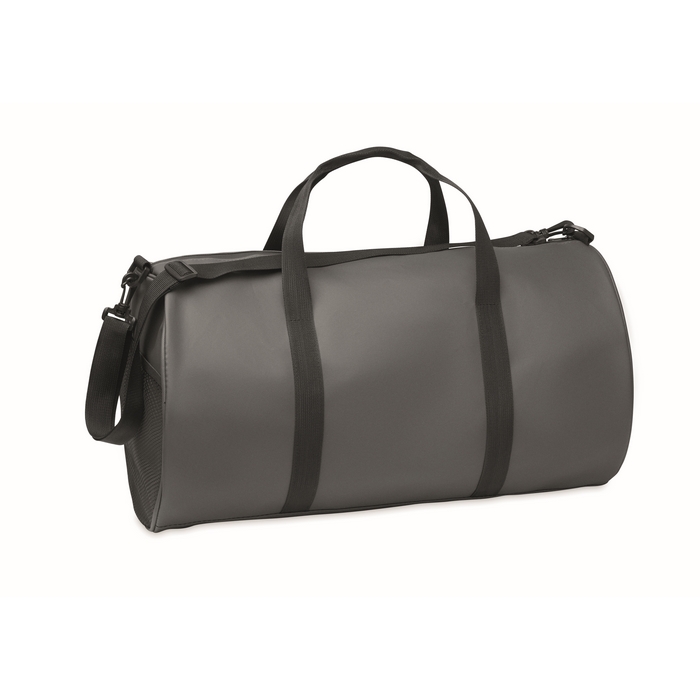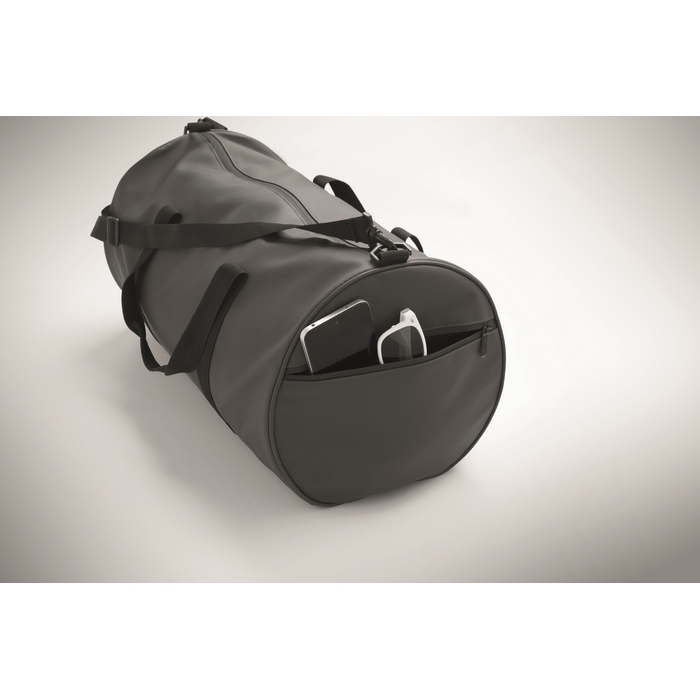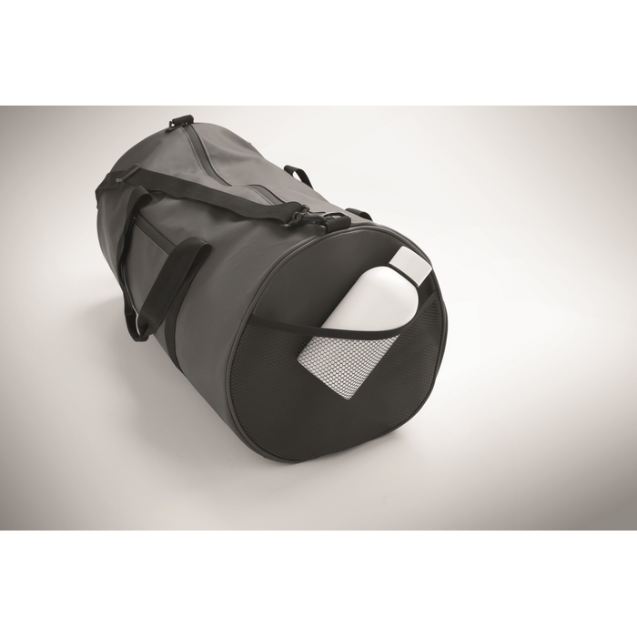 Duffle bag in 600D RPET polyester with PU coating. Front zippered pocket. Inside 210D RPET polyester lining. 1 side zippered compartment / 1 side mesh compartment. Zippered pocket inside.Dimensions: 51 x 28cm