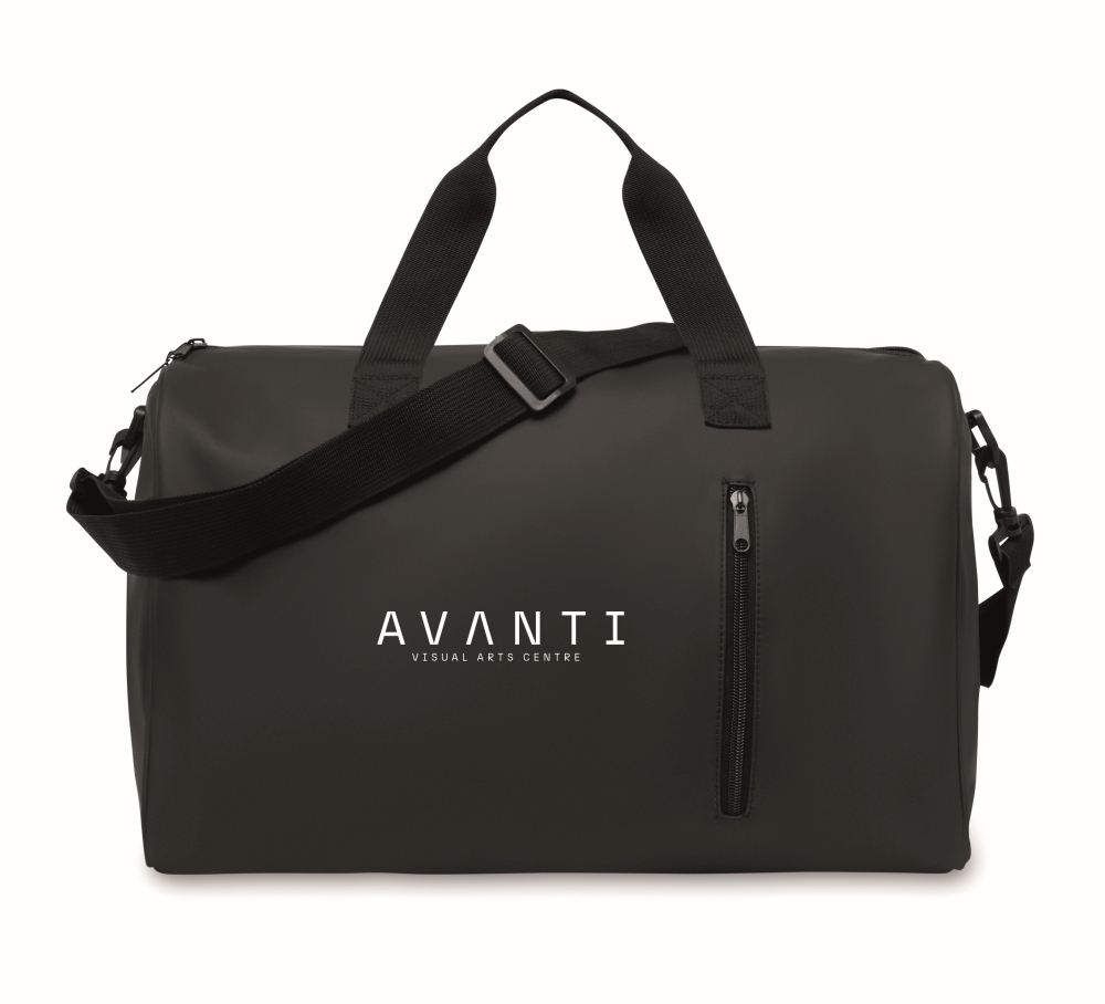 Duffle bag in soft PU with foam reinforcement to the base. One main compartment, zippered front pocket. 210D RPET polyester lining. 2 handles and one adjustable and detachable shoulder strap Dimensions: 44 x 27 x 28 cm
