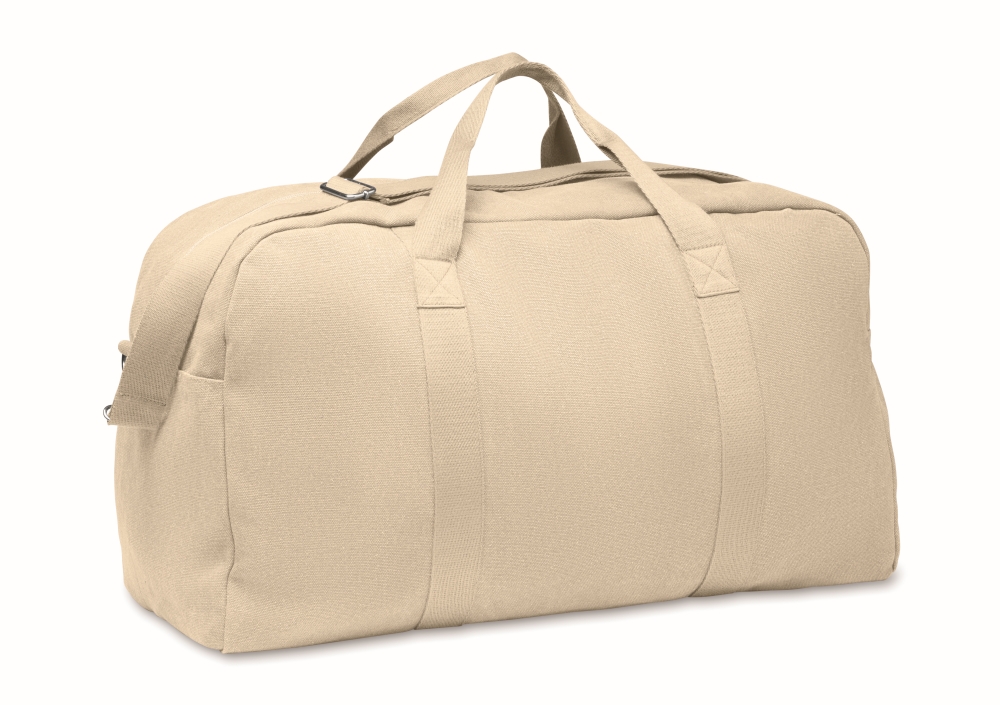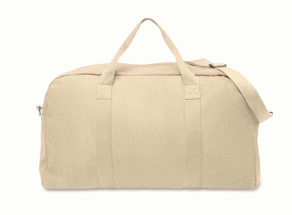 Duffle travel bag in recycled 450 gr/m2 fabrics (60% recycled cotton and 40% recycled polyester) with adjustable and detachable cotton strap. Dimensions: 57 x 33 x 27,5 cm