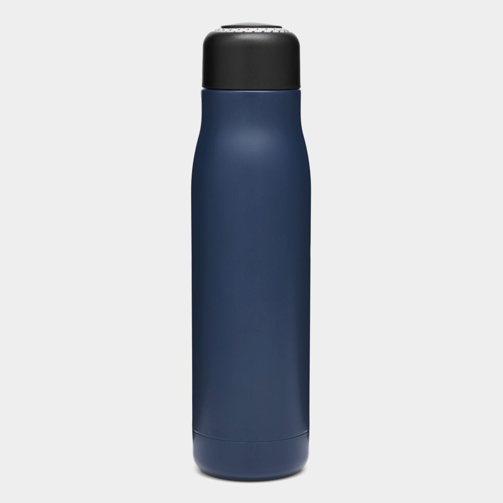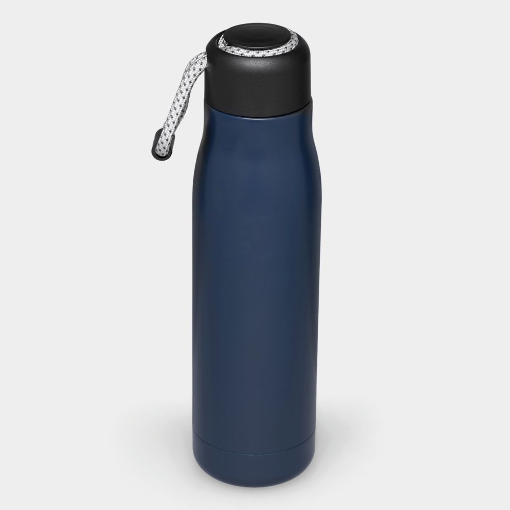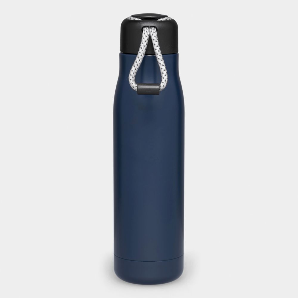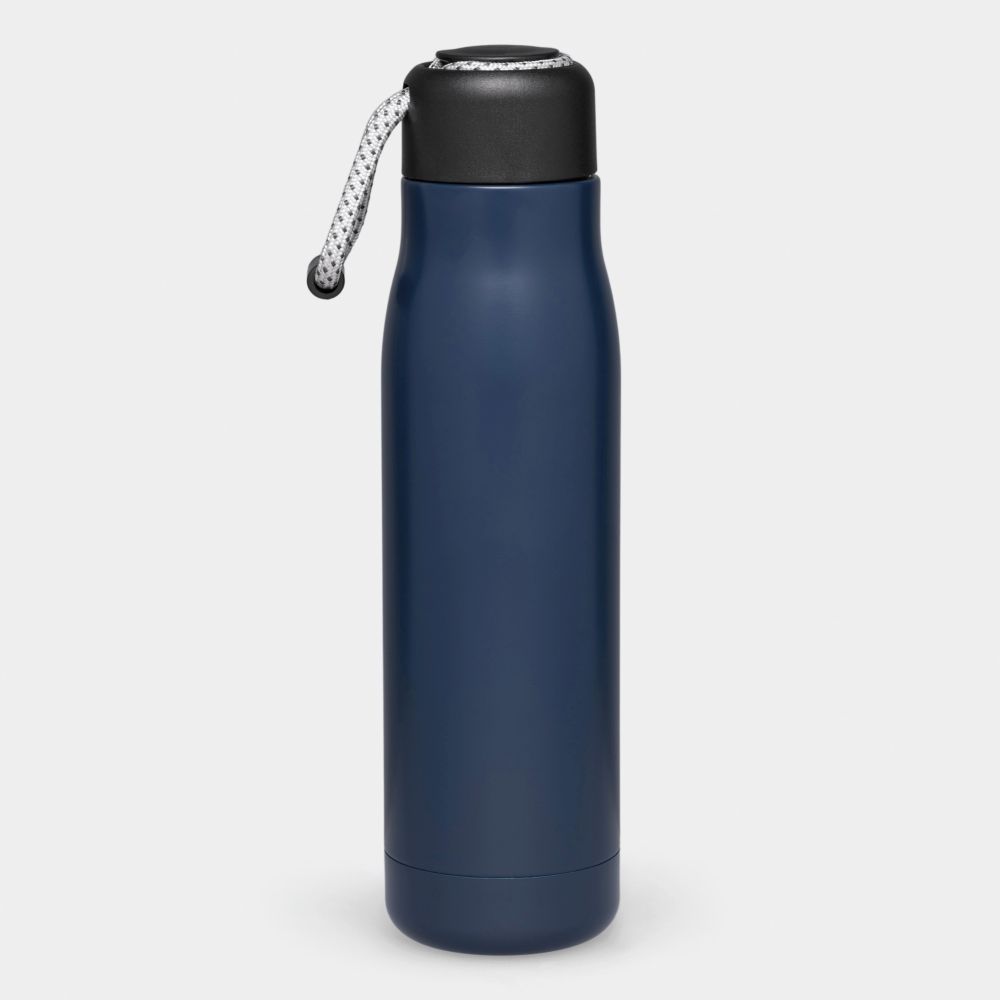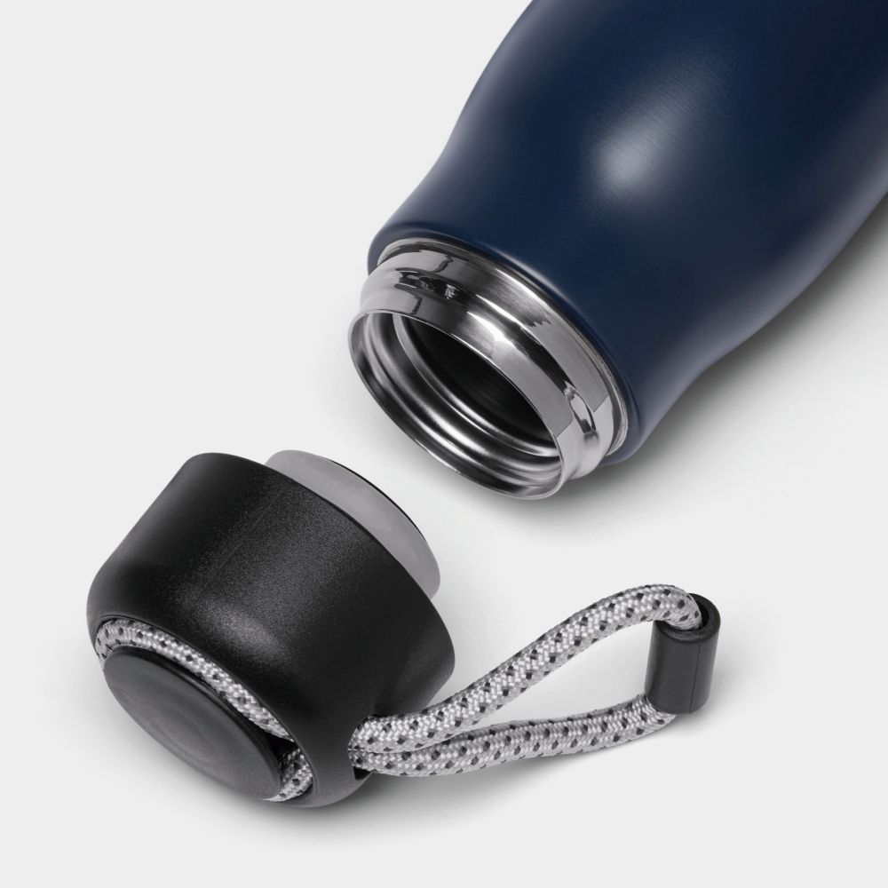 Insulated drinking bottle, double-walled: inside and outside made of stainless steel, secure black screw cap with carrying loop, capacity: approx. 500 ml, keeps warm for approx. 8 hours and cold for up to 12 hours. Dimension: O7x26 cm.