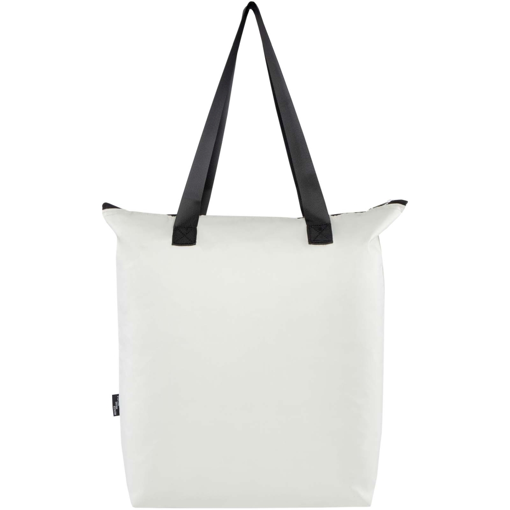 Designed for convenience and practicality, this lightweight yet durable tote cooler bag adapts to your needs by folding neatly into a compact pouch with a webbing loop to hang or carry around easily, making it perfect for picnics, grocery shopping, or outdoor adventures. Featuring a zipped main compartment with aluminium foil, a front open pocket, and two long handles made of quality smooth webbing material. Made of PVC free recycled polyester. Volume capacity: 15 litres. Dimensions: 42 x 41 x 12,5 cm