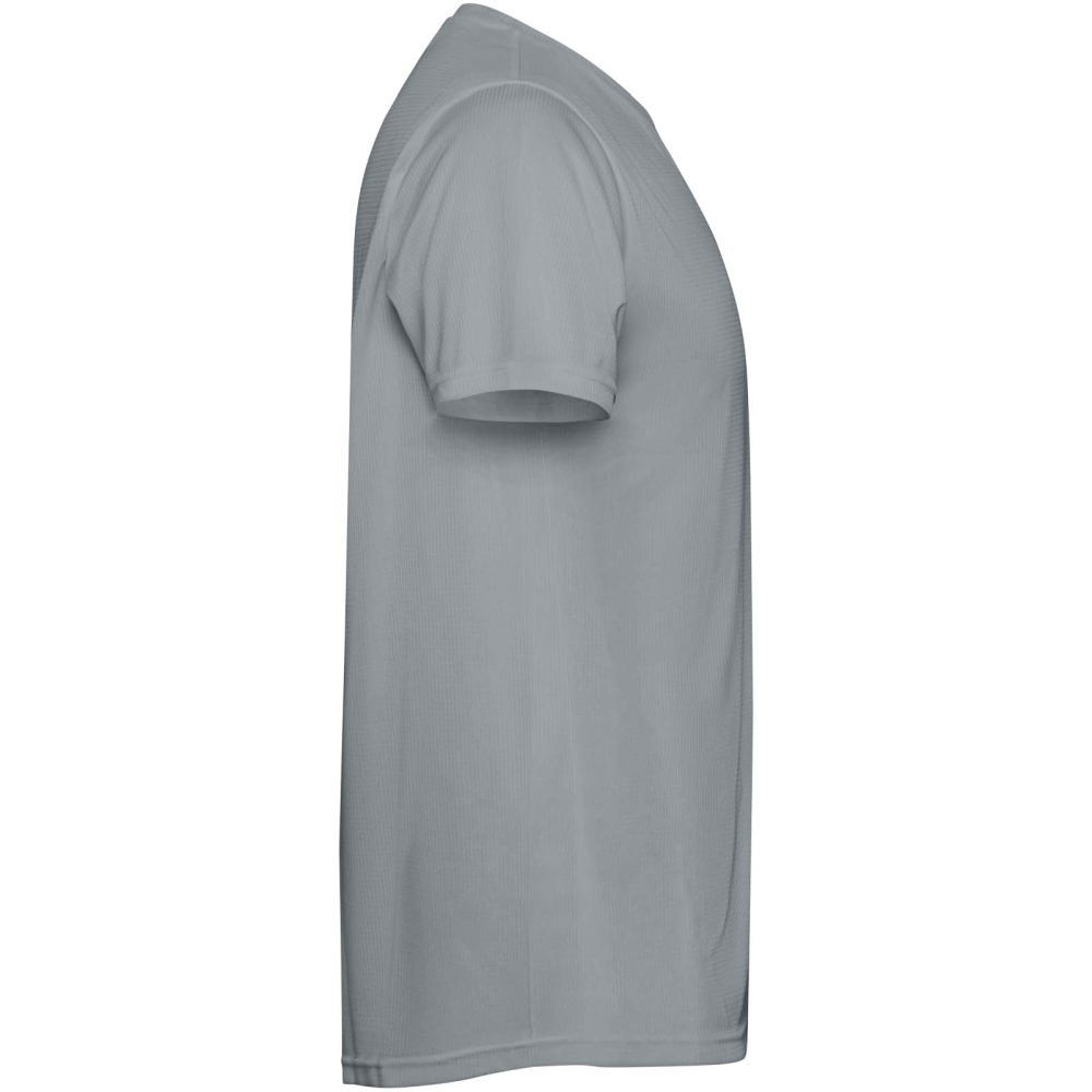 Short-sleeved technical t-shirt for kids. Collar with matching seams. Back hem slightly longer than the front. Side seams shifted forward.