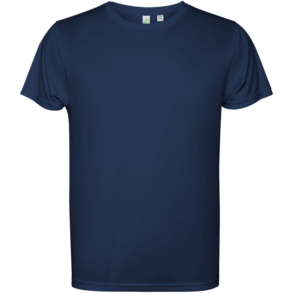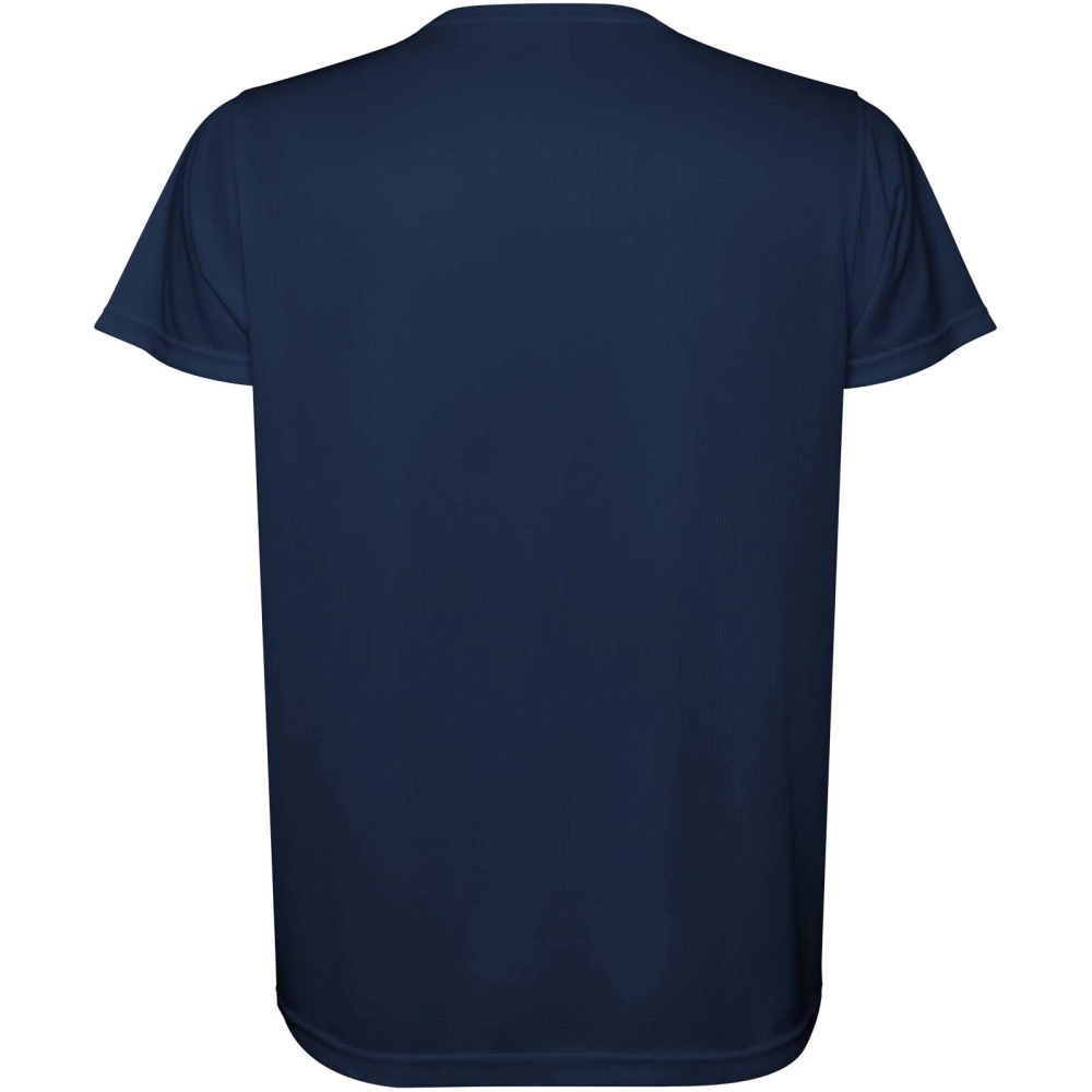 Short-sleeved technical t-shirt for kids. Collar with matching seams. Back hem slightly longer than the front. Side seams shifted forward.