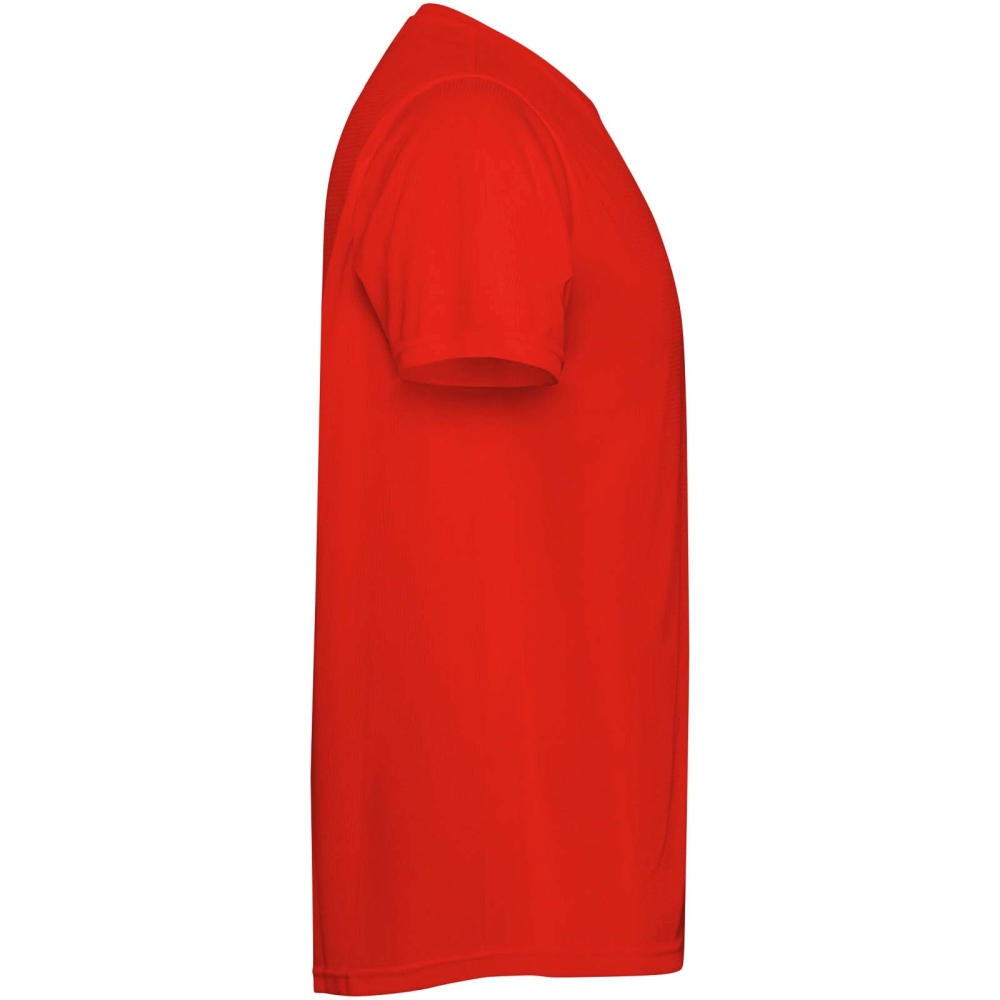 Short-sleeved technical t-shirt for kids. Collar with matching seams. Back hem slightly longer than the front. Side seams shifted forward.