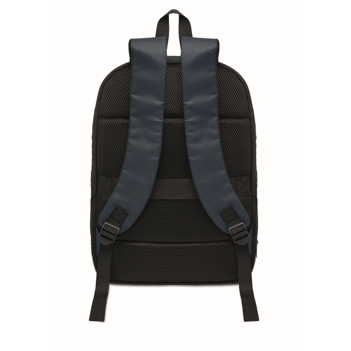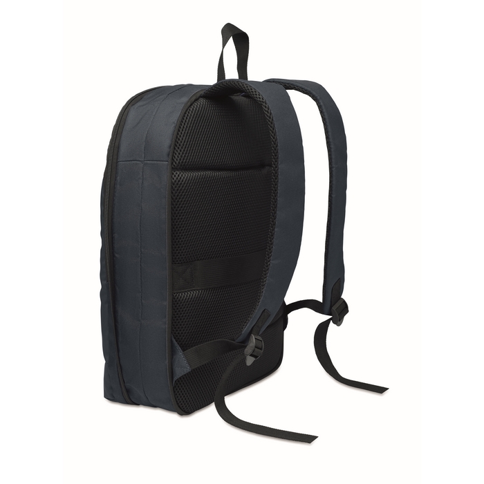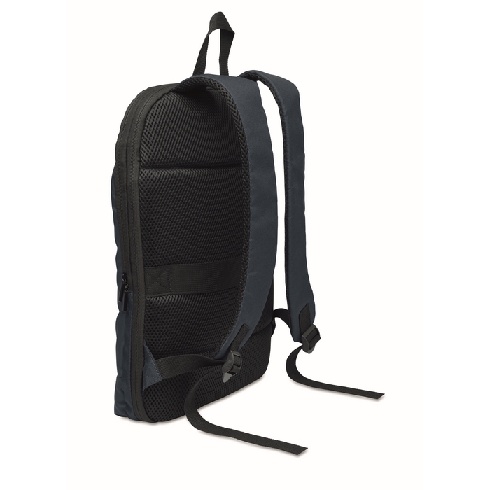 Expandable 600D RPET polyester computer backpack 16 with PU coating on front and RPET polyester lining. Hidden zippered pocket and padded laptop compartment, front compartment, mesh back and luggage strap.Dimensions: 30 x 6 x 44cm