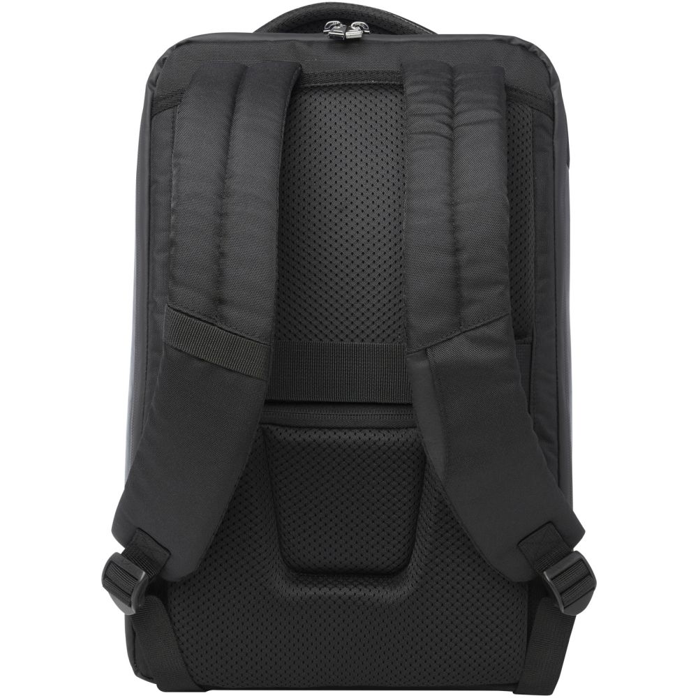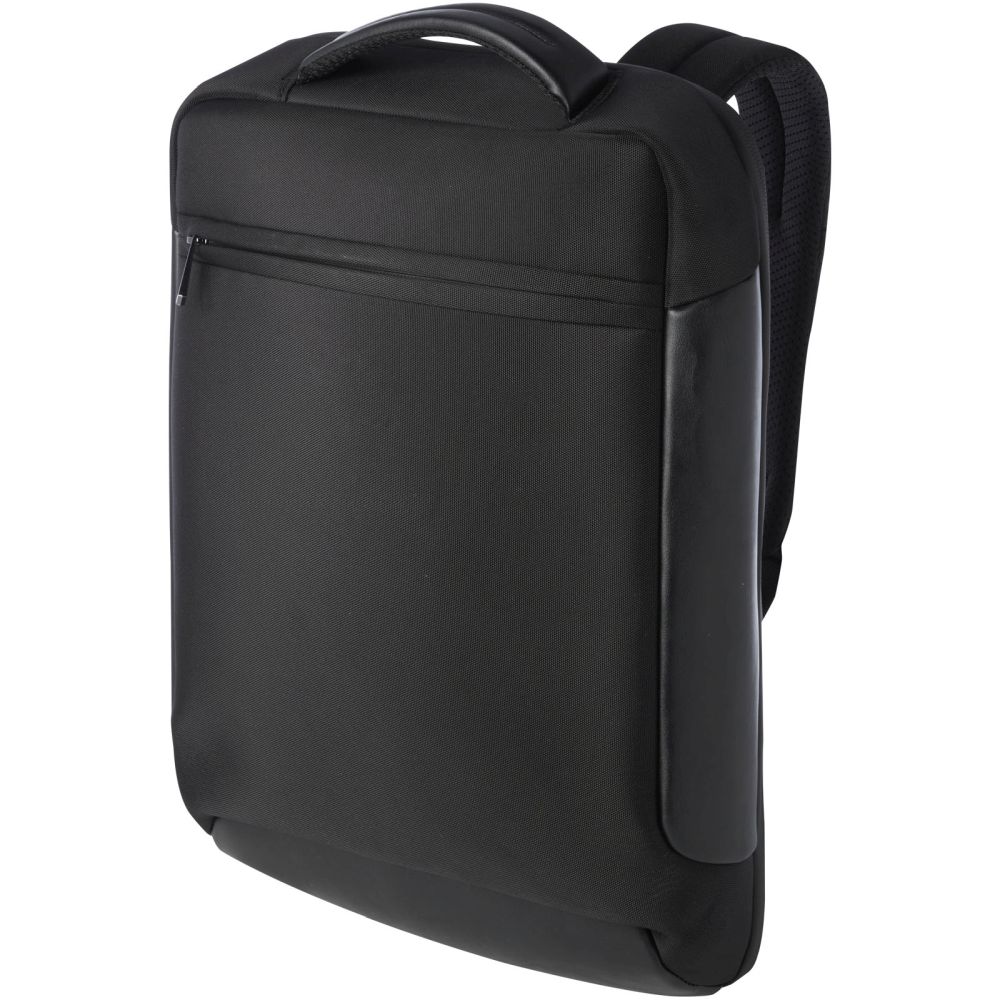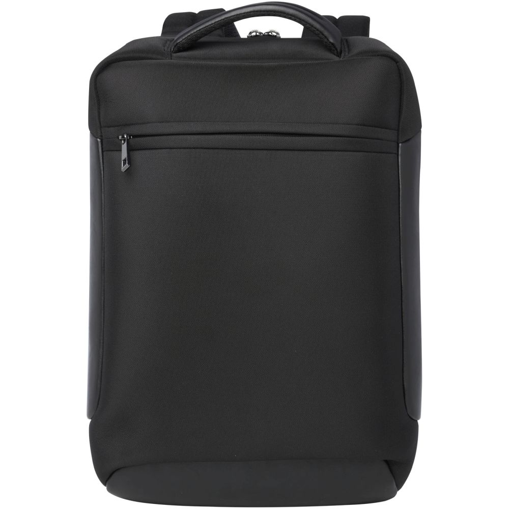 The sleek, compact and sturdy GRS certified Expedition Pro laptop backpack is a perfect companion for professionals on-the-go. It is made from water repellent 900D RPET, coupled with premium PU elements and RPET lining. It features a dedicated 15.6" laptop compartment, a tablet sleeve, multiple organisational pockets, a zipped front pocket and a hidden pocket right beneath the luggage strap on the back. Constructed with padded and adjustable shoulder straps, an integrated card sleeve pocket, a sunglasses loop, moulded air mesh backing as well as a padded handle, ensuring maximum carrying comfort and convenience. Volume capacity: 12 litres. PVC free.