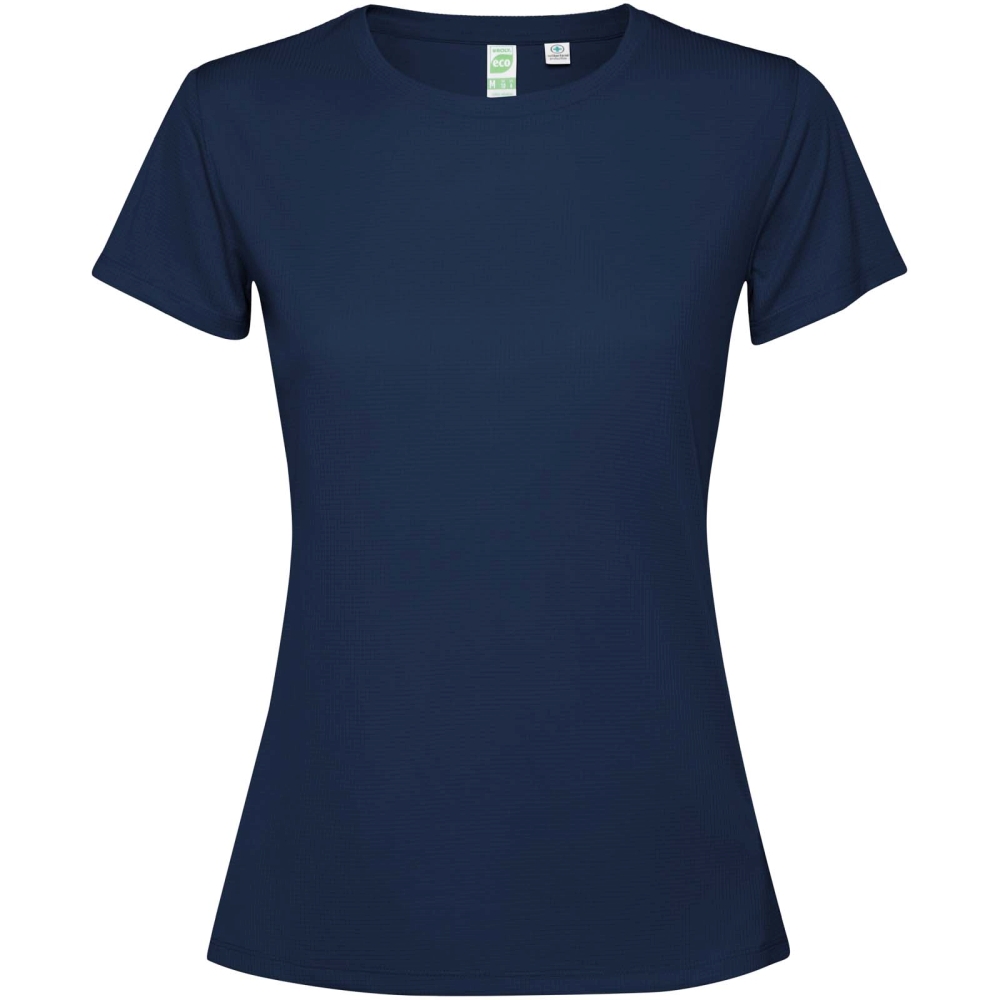 Short-sleeved fitted technical t-shirt for women. Collar with matching seams. Back hem slightly longer than the front. Side seams shifted forward.