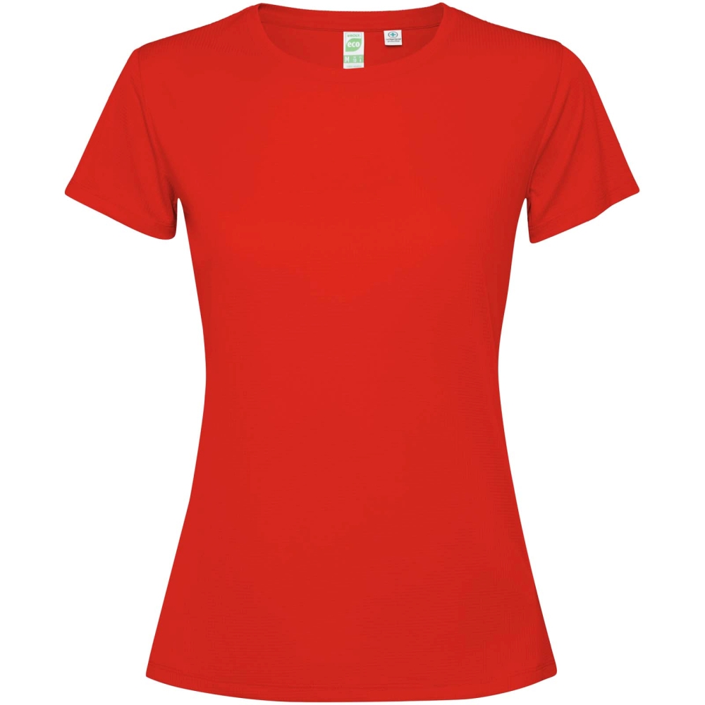 Short-sleeved fitted technical t-shirt for women. Collar with matching seams. Back hem slightly longer than the front. Side seams shifted forward.
