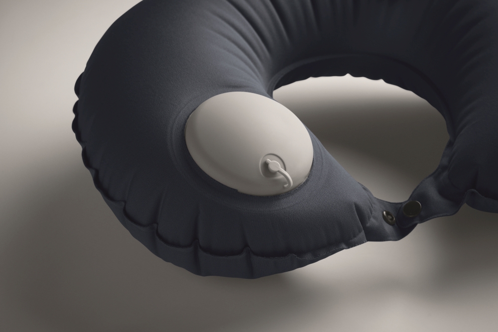 Fast inflatable pillow in milk silk fabric with built-in pump and release system. Pouch in self-material. Dimensions: 48 x 32 cm