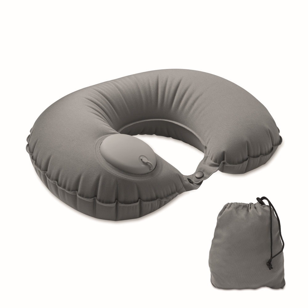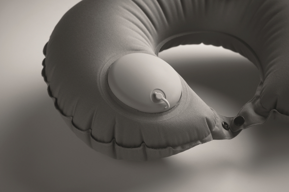 Fast inflatable pillow in milk silk fabric with built-in pump and release system. Pouch in self-material. Dimensions: 48 x 32 cm