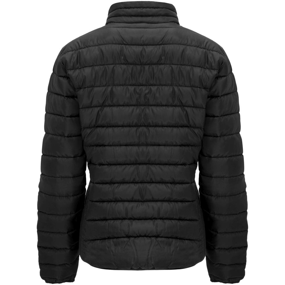 Womens quilted jacket with feather touch padding. Inverted zippers with matching chin protector and puller. Two front pockets with zippers. Matching elastic edging in collar, cuffs and hem. Contrasting inner lining. Includes stow carry bag. Lightweight and foldable garment. Fitted cut. Removable label. Water resistant. Wind-proof. The model is 179 cm and is wearing size S.