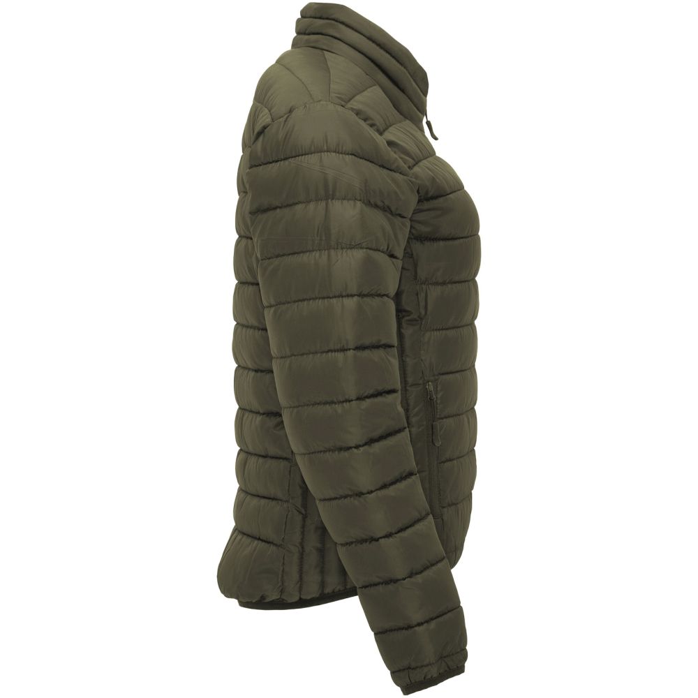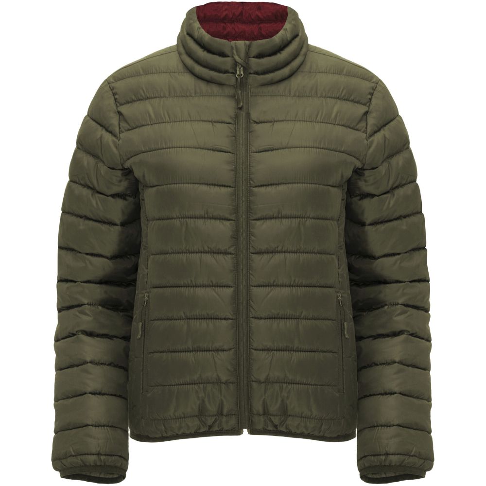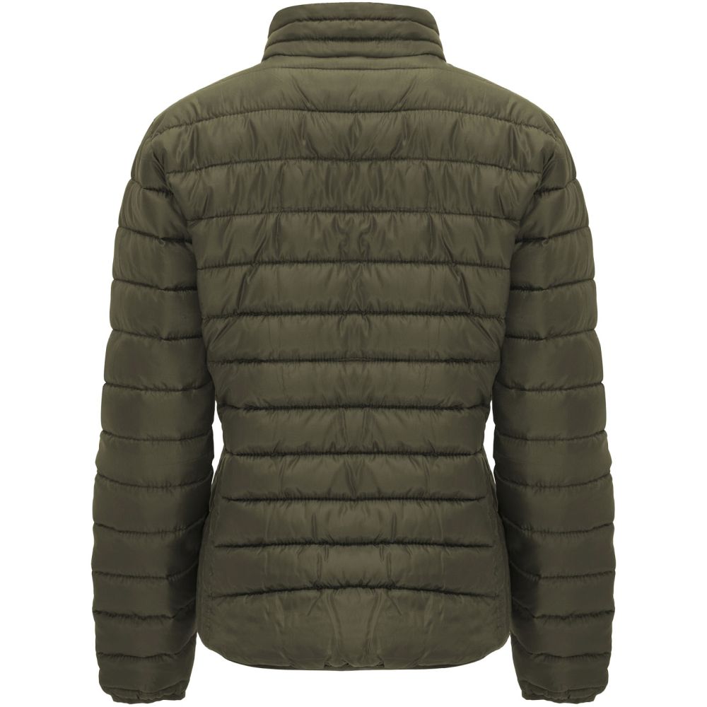 Womens quilted jacket with feather touch padding. Inverted zippers with matching chin protector and puller. Two front pockets with zippers. Matching elastic edging in collar, cuffs and hem. Contrasting inner lining. Includes stow carry bag. Lightweight and foldable garment. Fitted cut. Removable label. Water resistant. Wind-proof. The model is 179 cm and is wearing size S.