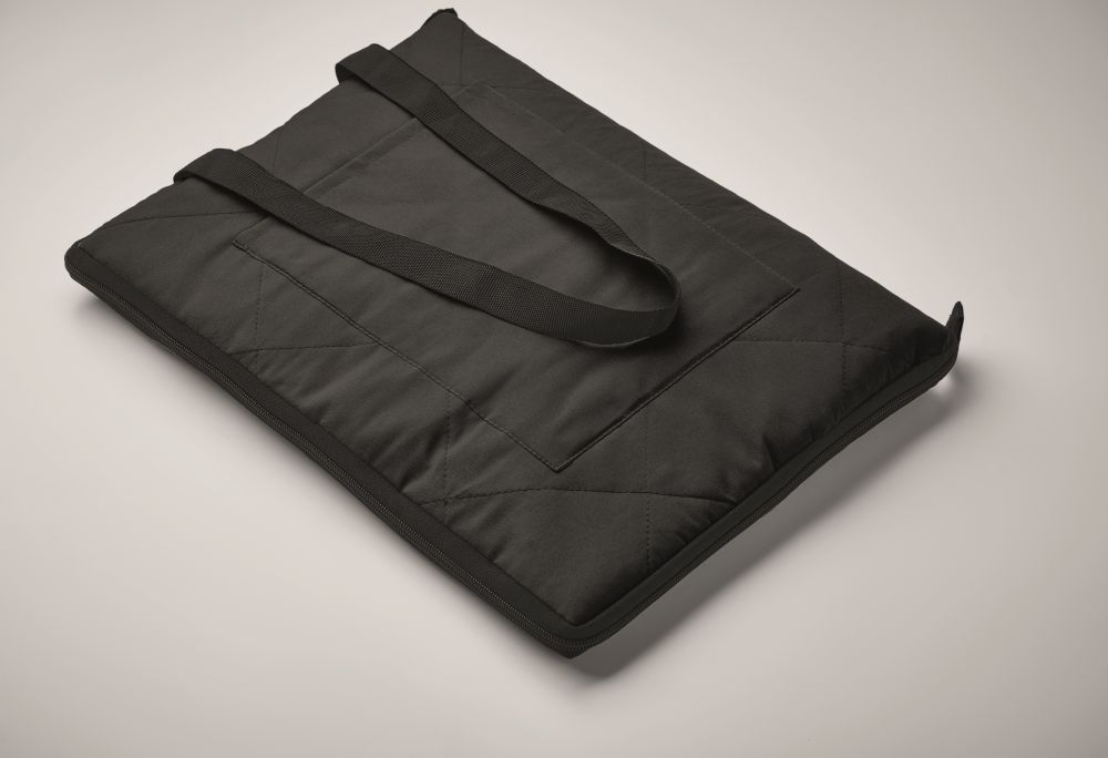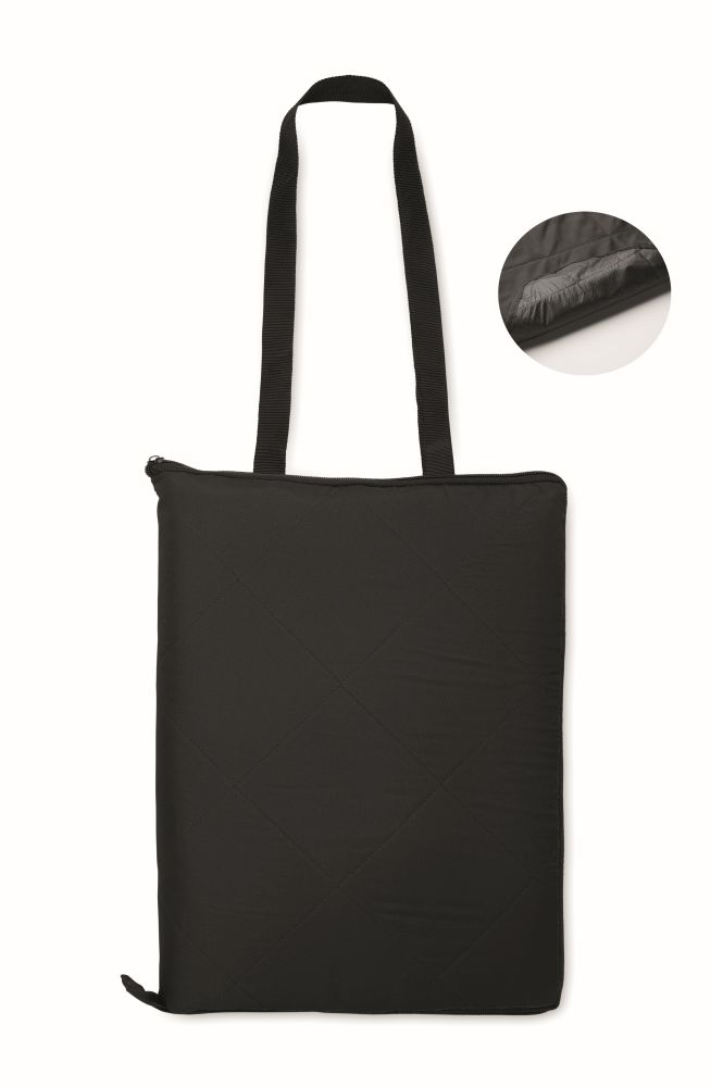 Foldable quilted picnic blanket with plastic coated PEVA on the reverse side. Folds into a convenient carry tote bag and has an adjustable shoulder strap. It includes a large front side pocket.