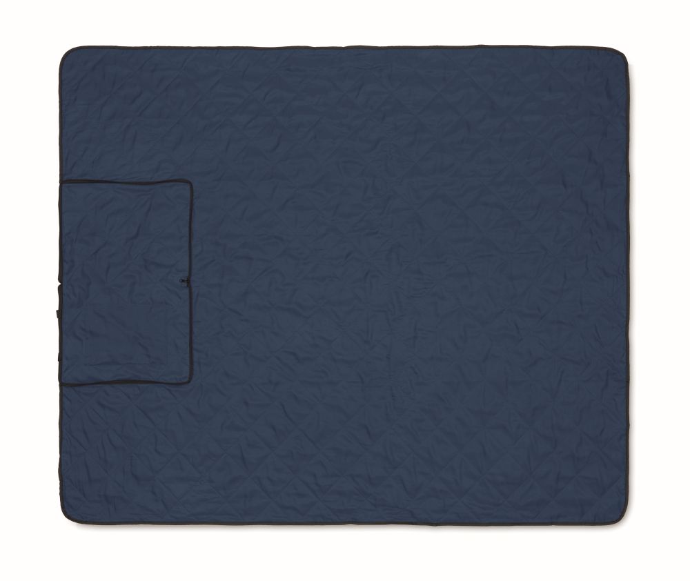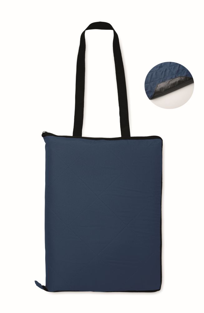 Foldable quilted picnic blanket with plastic coated PEVA on the reverse side. Folds into a convenient carry tote bag and has an adjustable shoulder strap. It includes a large front side pocket.