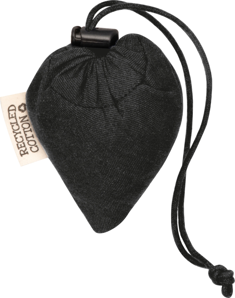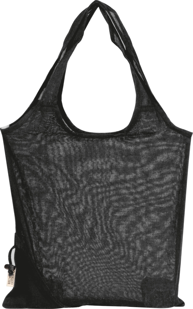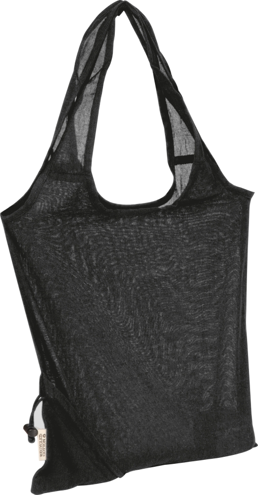 Shopping bag made of recycled cotton and polyester with a grammage of 118 g/m2. The bag can be folded up to save space. We print your logo on one side. Dimensions: 37 x 0,3 x 37 cm